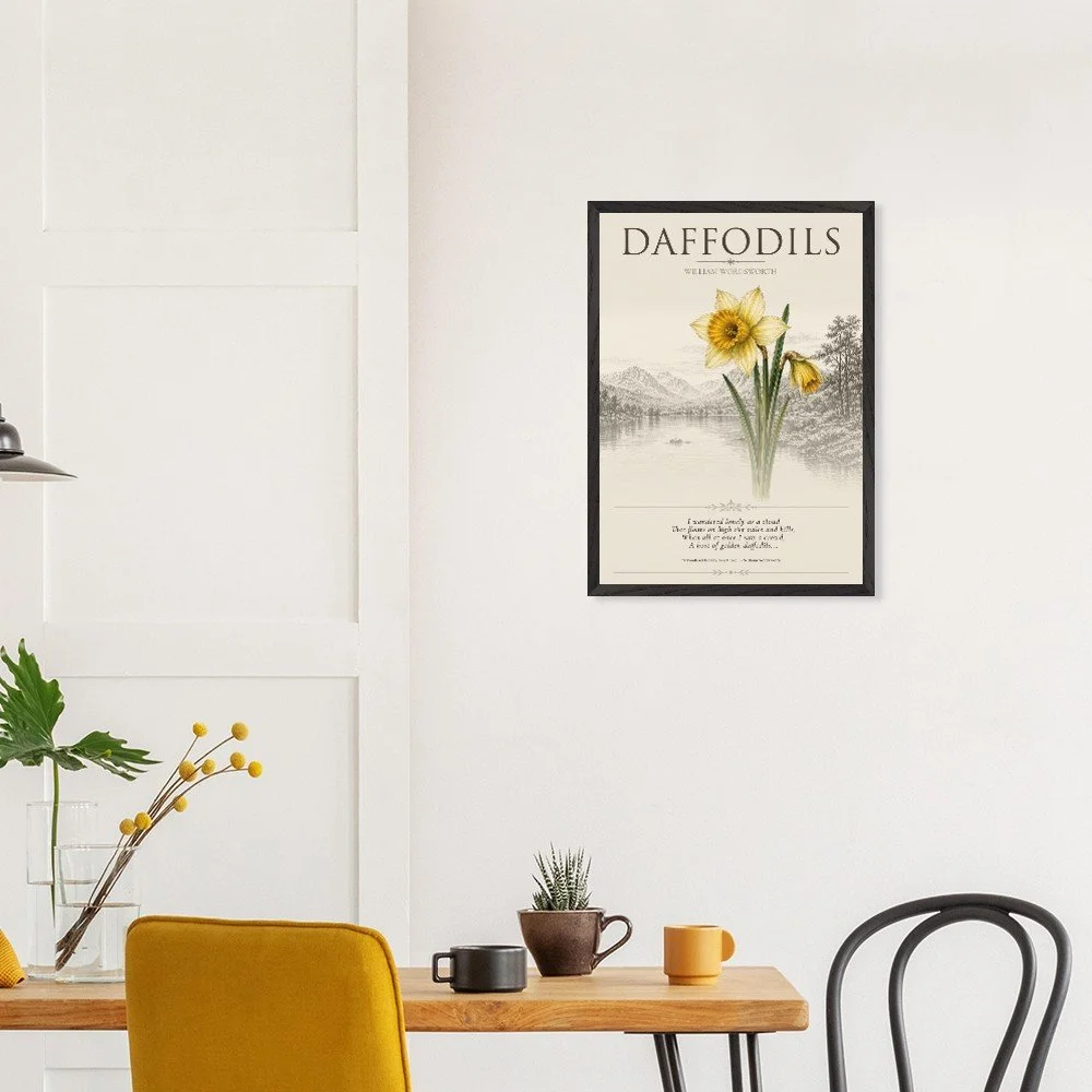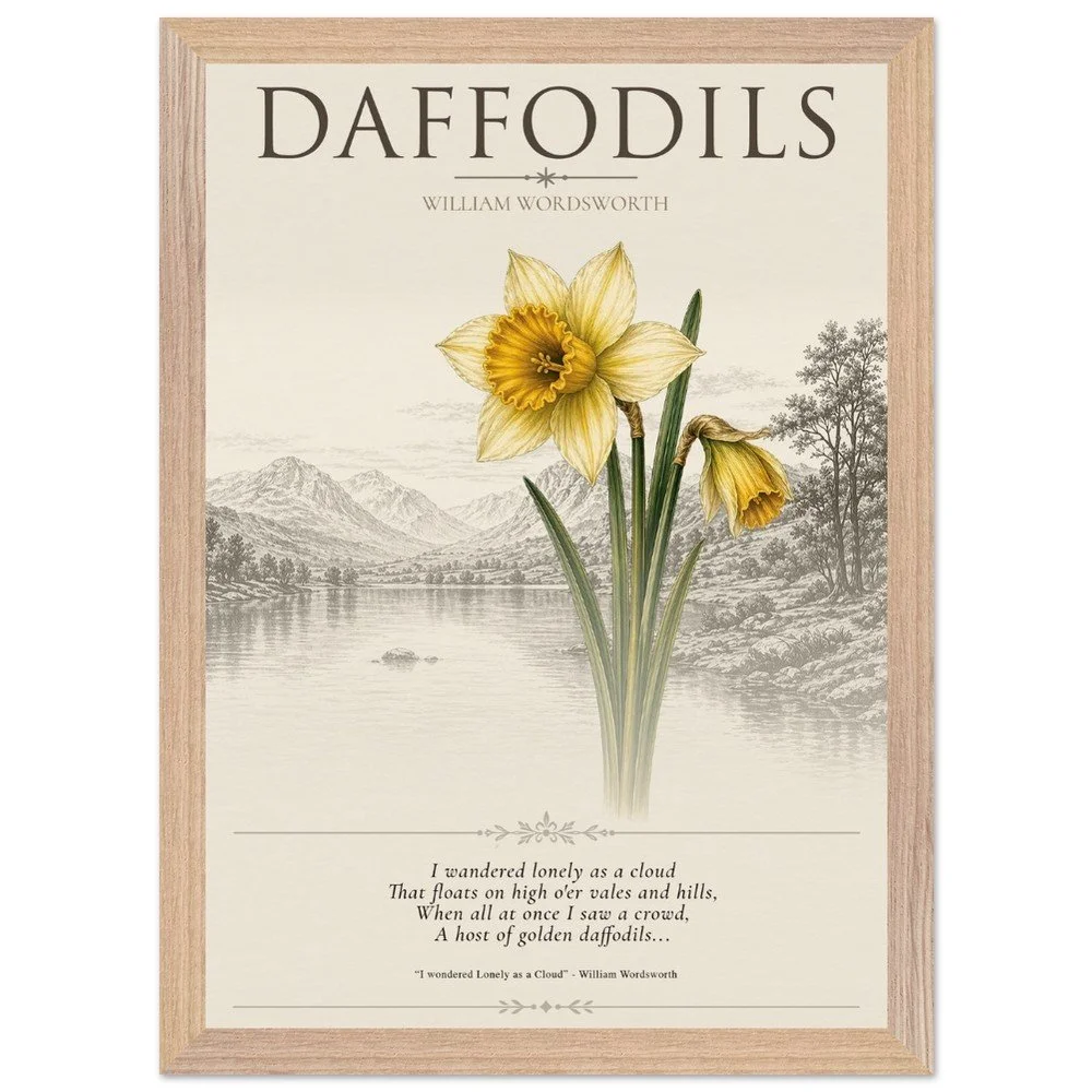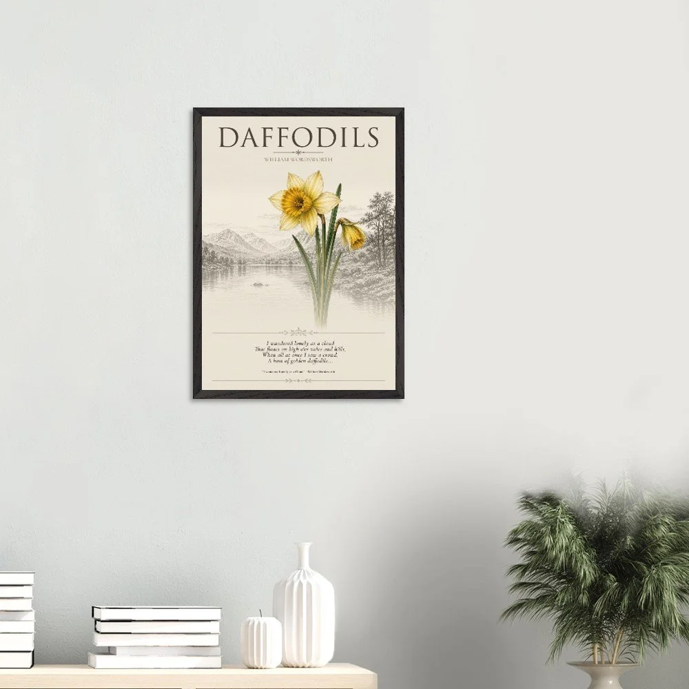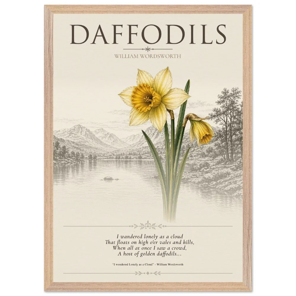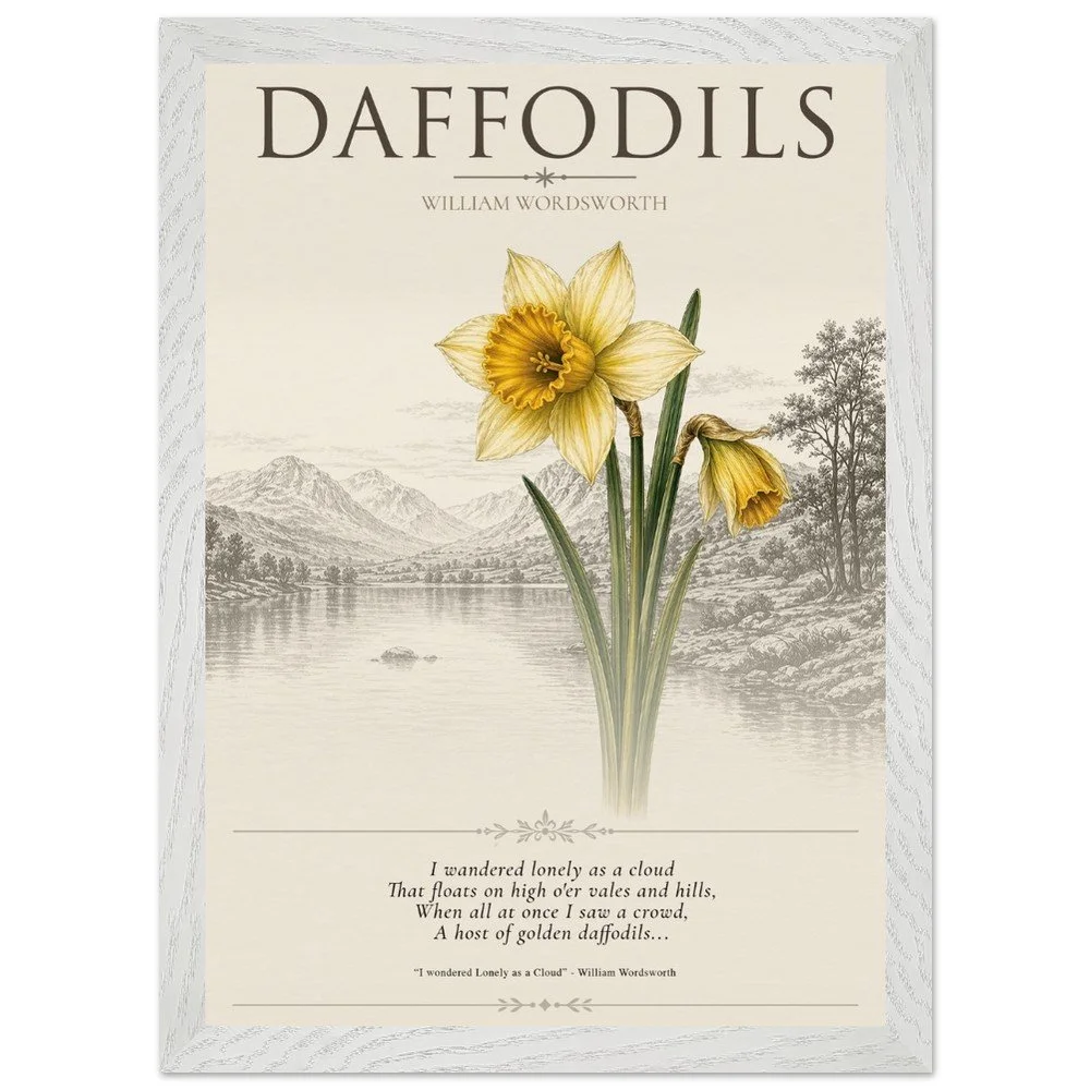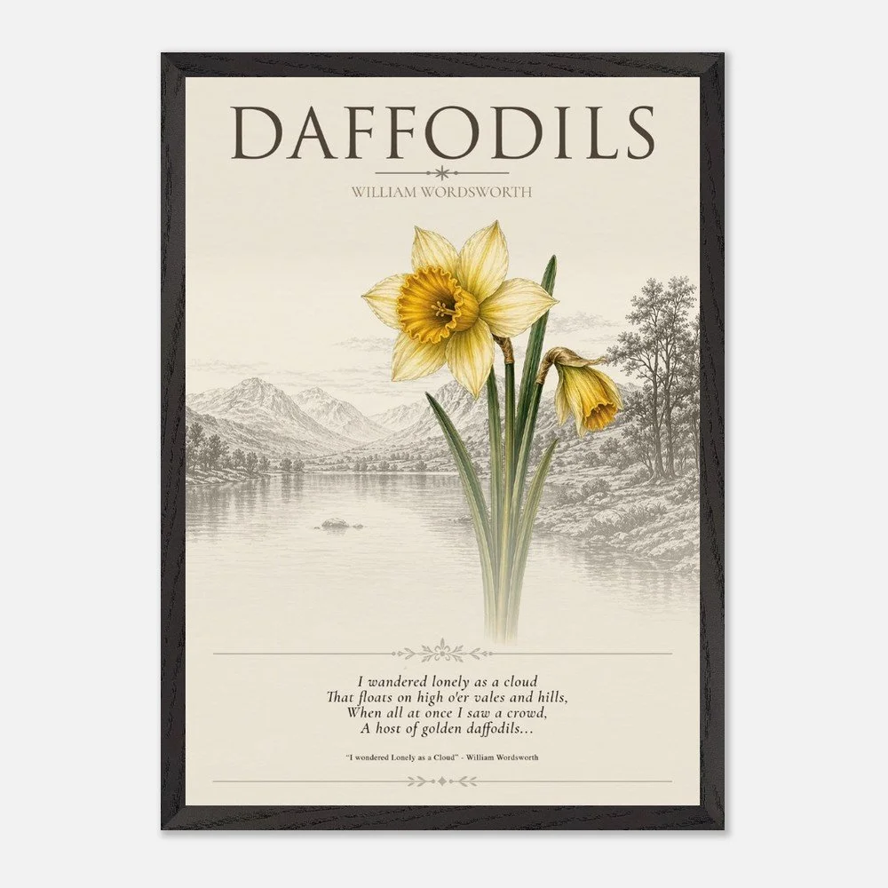 Daffodils — Nature & Joy Inspired by the timeless poetry of William Wordsworth, this elegant botanical print celebrates the quiet beauty and uplifting spirit of the daffodil. A finely detailed illustration is paired with a classic verse, creating a piece that brings a sense of calm, reflection, and natural joy to any space. Perfect for living rooms, studies, or reading corners, this artwork captures the enduring connection between nature and emotion. 3 SIZES • A1: 23.4 × 33.1 inch • A2: 16.5 × 23.4 inch • A3: 11.7 × 16.5 inch PRODUCT DETAILS • Framed Print - Ready-to-hang, responsibly sourced oak or ash • Paper - Museum-quality paper—off-white, uncoated, 250 gsm • Protection - Shatterproof plexiglass protects the framed art