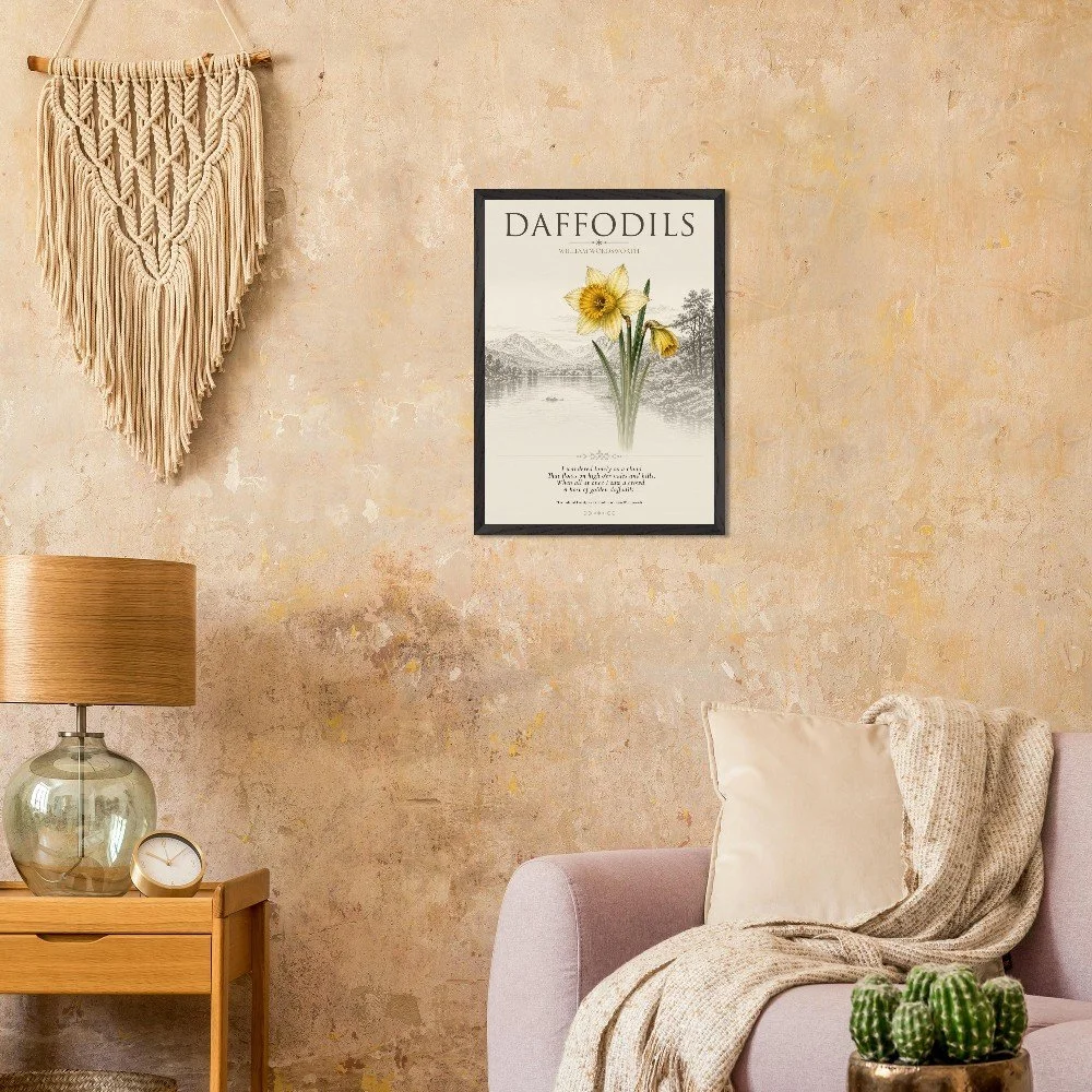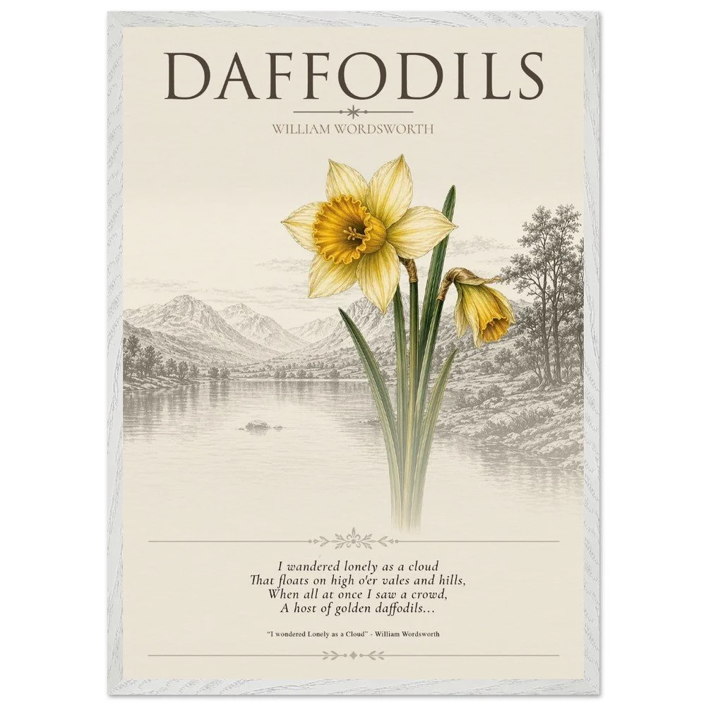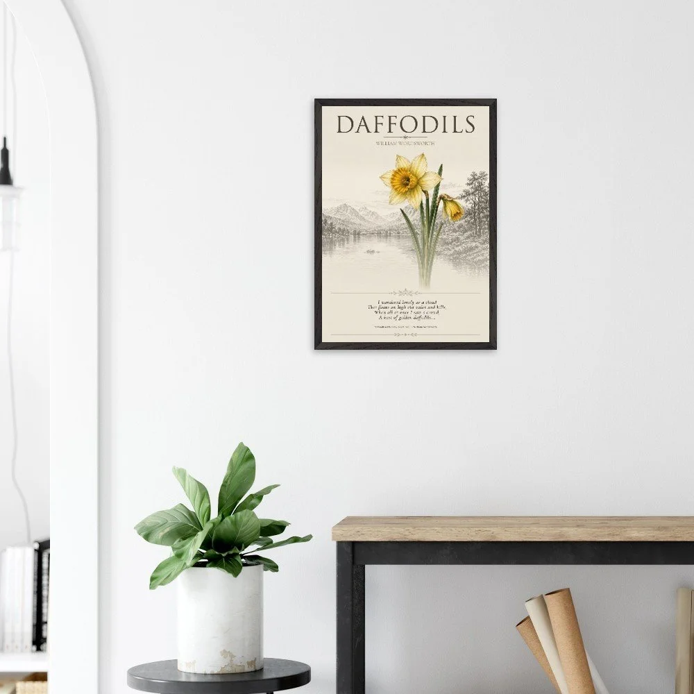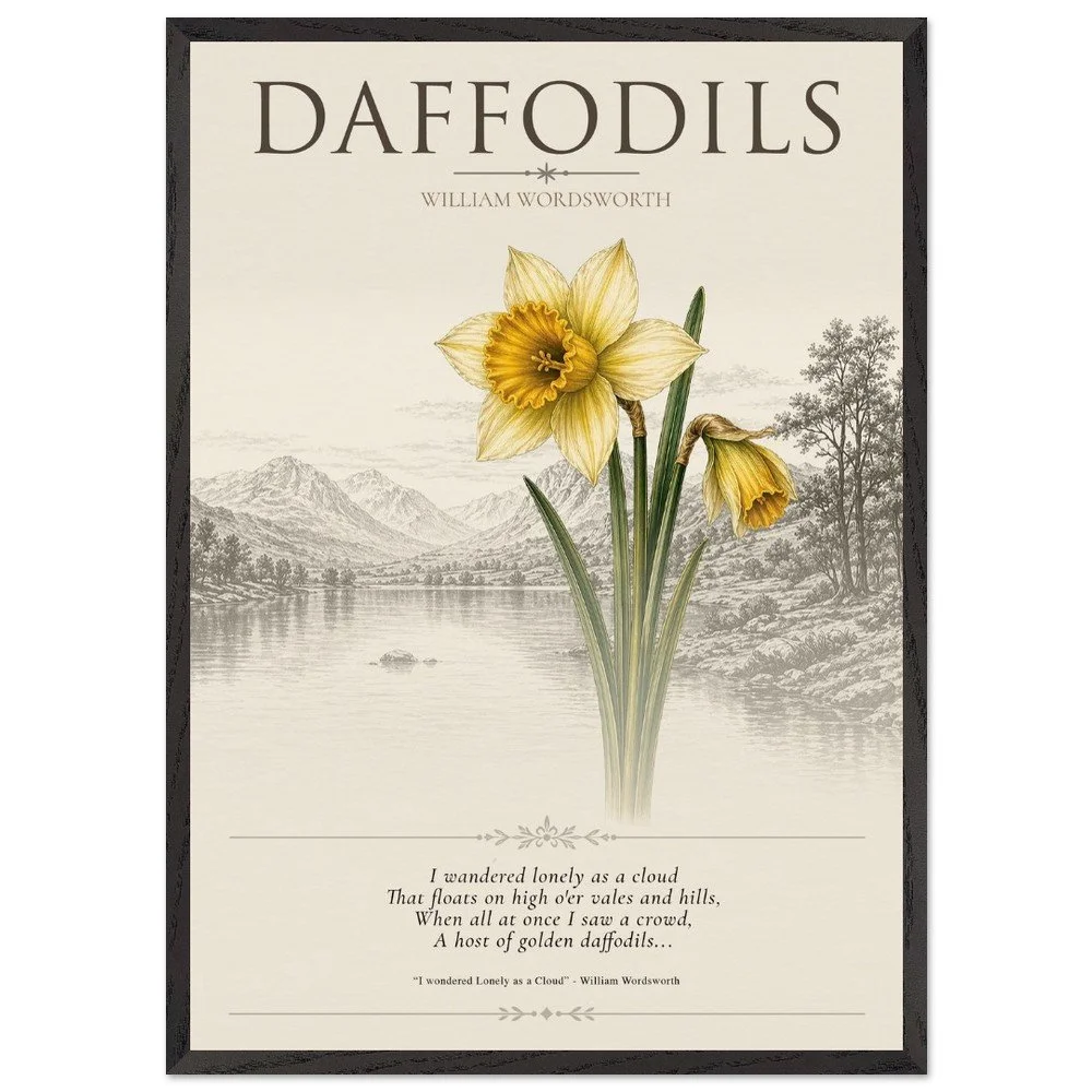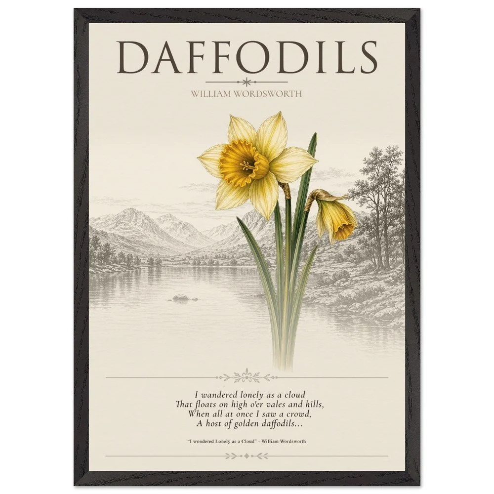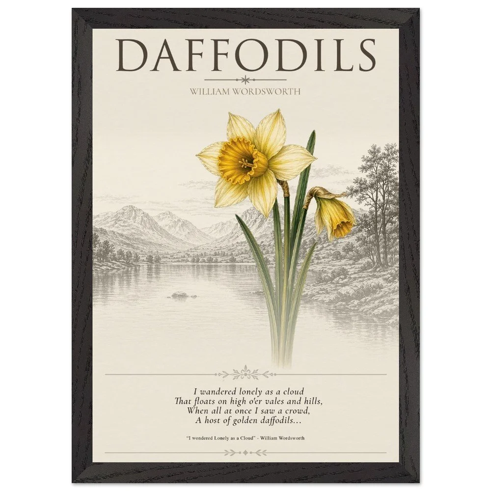 Daffodils — Nature & Joy Inspired by the timeless poetry of William Wordsworth, this elegant botanical print celebrates the quiet beauty and uplifting spirit of the daffodil. A finely detailed illustration is paired with a classic verse, creating a piece that brings a sense of calm, reflection, and natural joy to any space. Perfect for living rooms, studies, or reading corners, this artwork captures the enduring connection between nature and emotion. 3 SIZES • A1: 23.4 × 33.1 inch • A2: 16.5 × 23.4 inch • A3: 11.7 × 16.5 inch PRODUCT DETAILS • Framed Print - Ready-to-hang, responsibly sourced oak or ash • Paper - Museum-quality paper—off-white, uncoated, 250 gsm • Protection - Shatterproof plexiglass protects the framed art