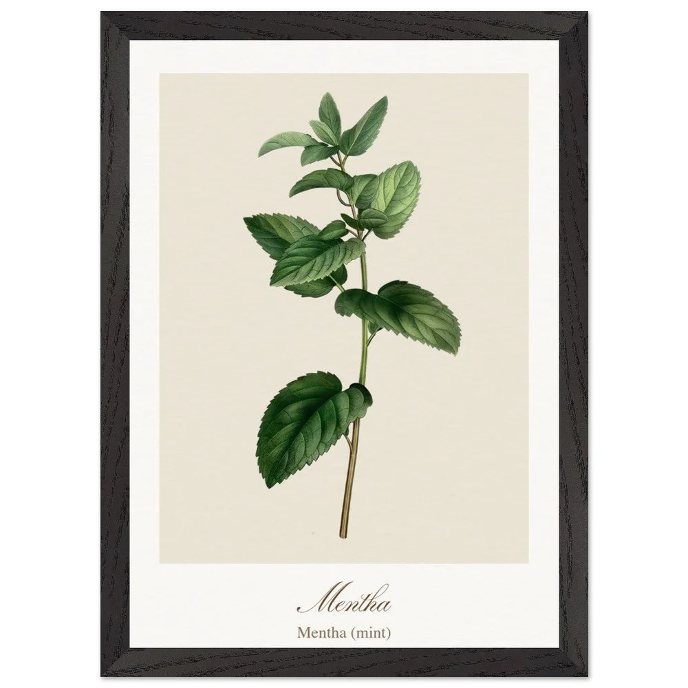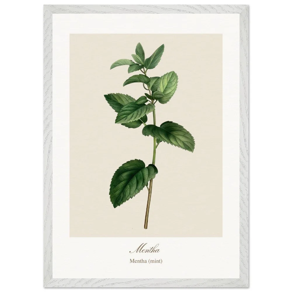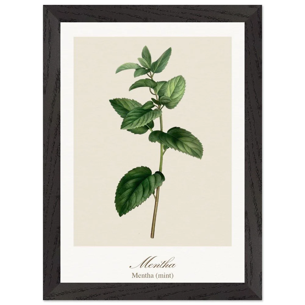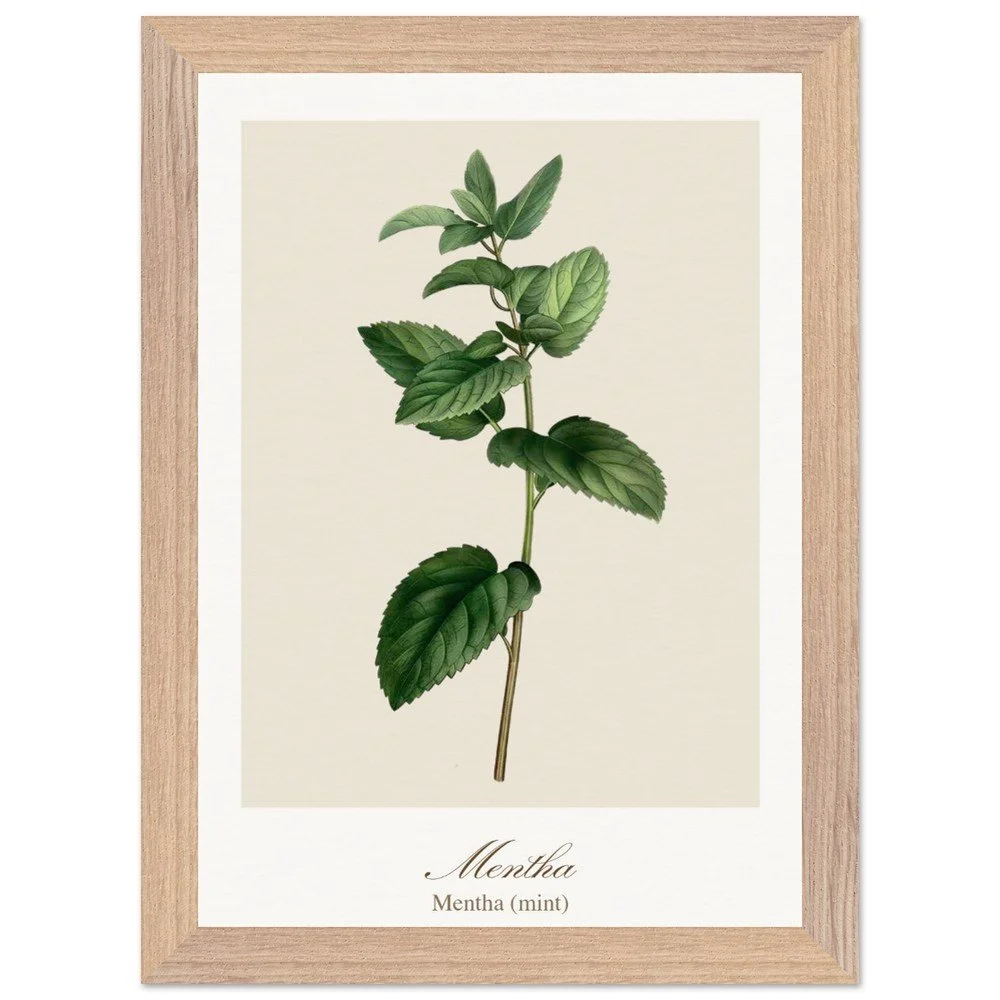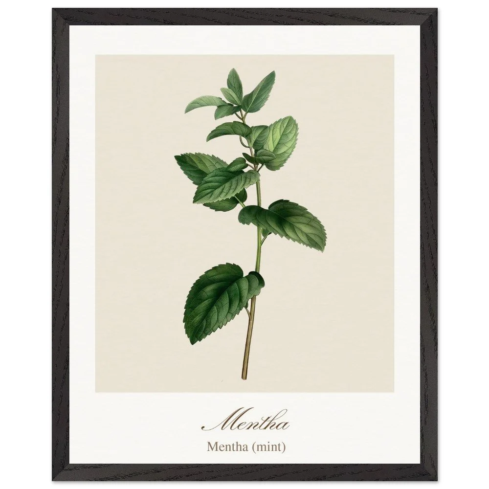Fresh and vibrant, Mentha (mint) is celebrated for its crisp aroma and revitalising qualities, symbolising clarity and renewal. The lively leaf shapes and rich green tones bring energy to any space, making it a perfect addition to kitchens, breakfast nooks, or modern interiors. Combine with other herb prints to create a cohesive and refreshing botanical display. PRODUCT DETAILS • Framed Print - Ready-to-hang, responsibly sourced oak or ash • Paper - Museum-quality paper—off-white, uncoated, 250 gsm • Protection - Shatterproof plexiglass protects the framed art