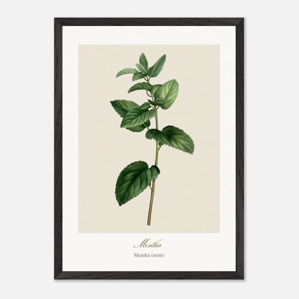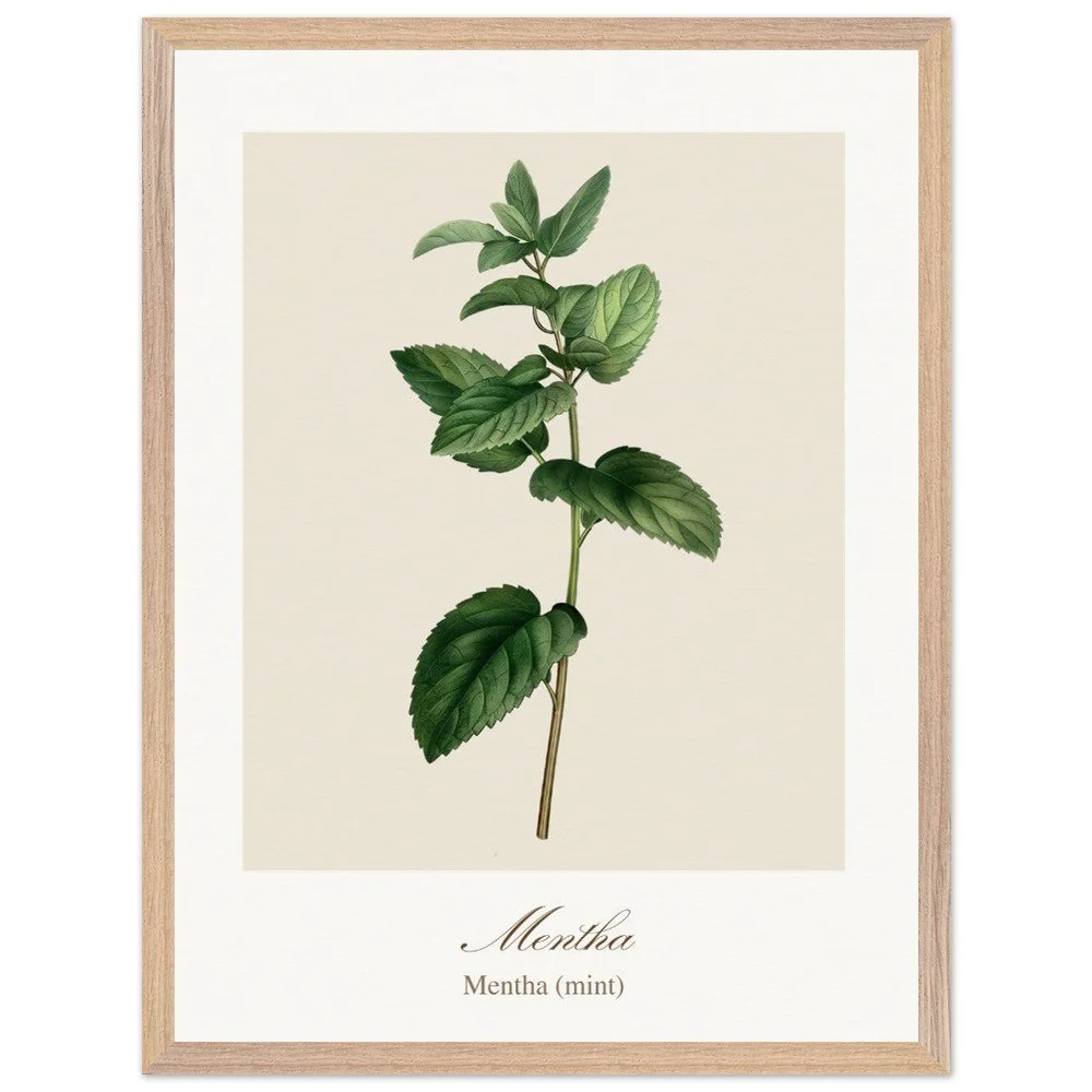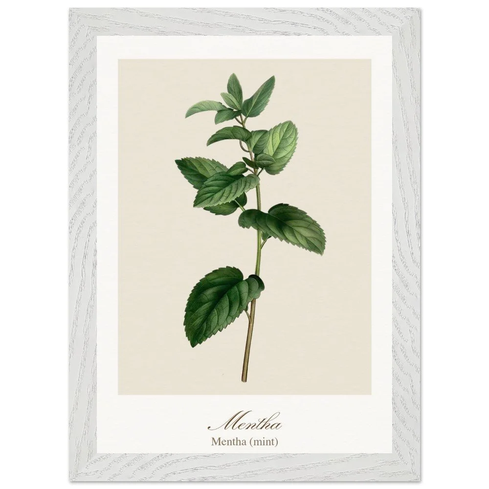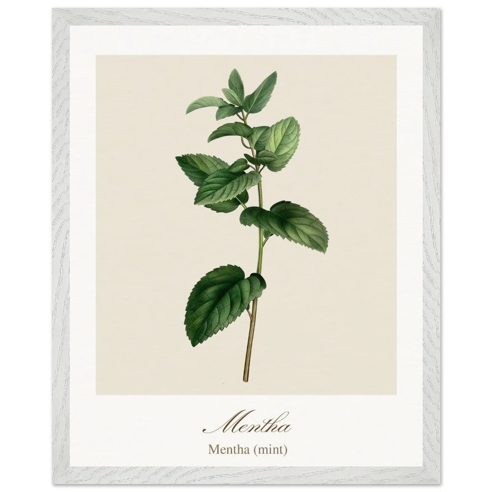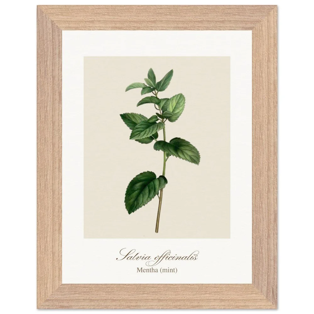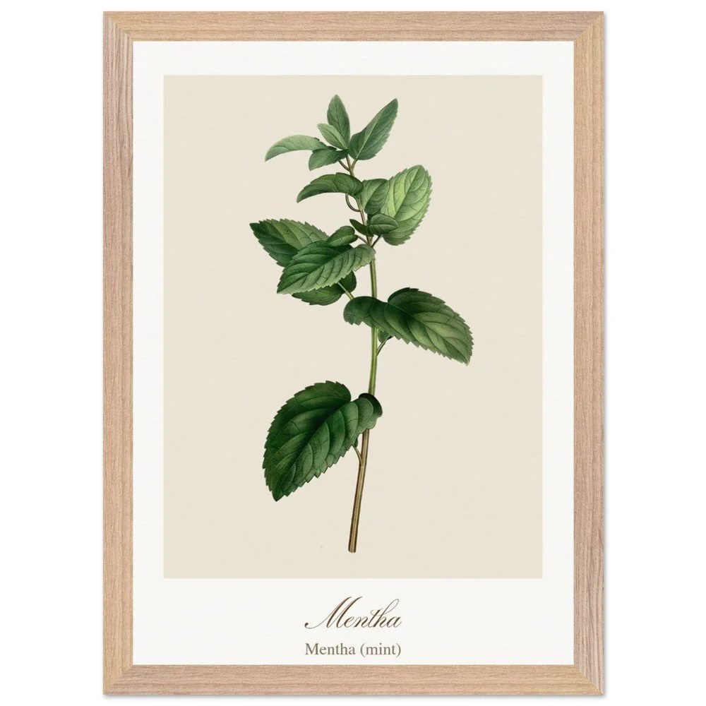 Fresh and vibrant, Mentha (mint) is celebrated for its crisp aroma and revitalising qualities, symbolising clarity and renewal. The lively leaf shapes and rich green tones bring energy to any space, making it a perfect addition to kitchens, breakfast nooks, or modern interiors. Combine with other herb prints to create a cohesive and refreshing botanical display. PRODUCT DETAILS • Framed Print - Ready-to-hang, responsibly sourced oak or ash • Paper - Museum-quality paper—off-white, uncoated, 250 gsm • Protection - Shatterproof plexiglass protects the framed art