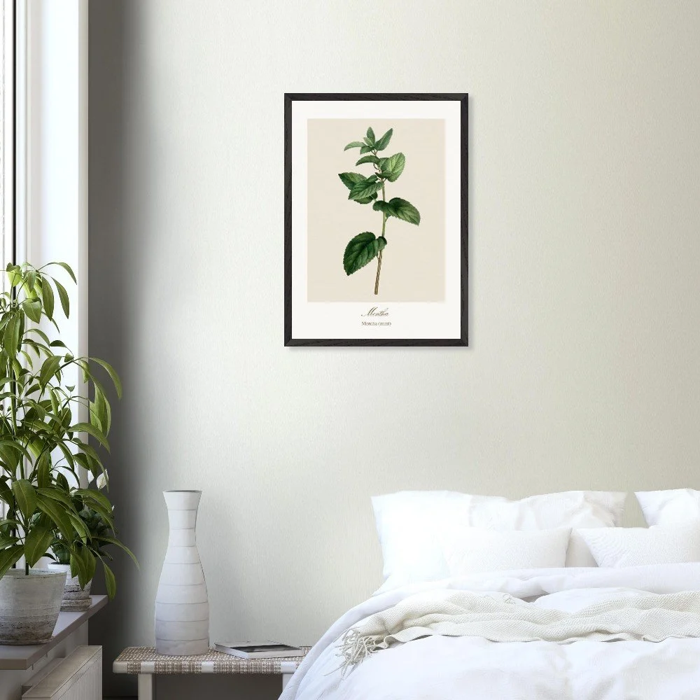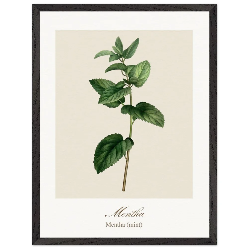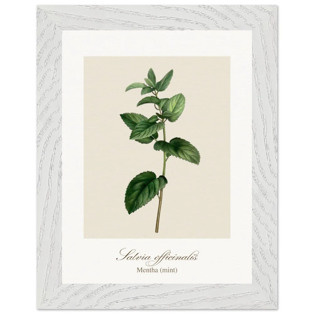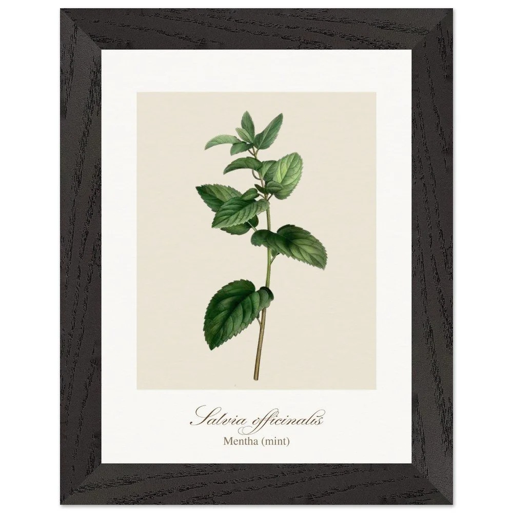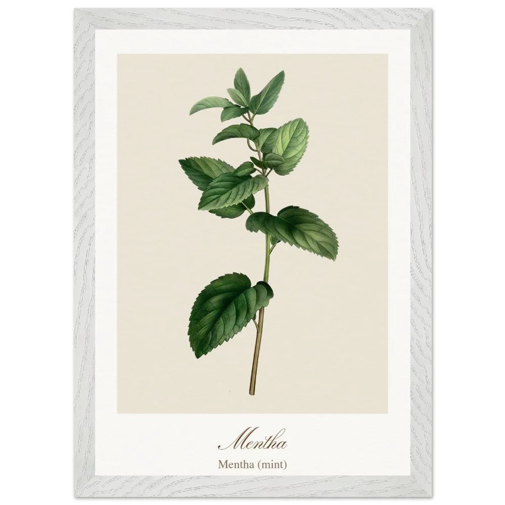 Fresh and vibrant, Mentha (mint) is celebrated for its crisp aroma and revitalising qualities, symbolising clarity and renewal. The lively leaf shapes and rich green tones bring energy to any space, making it a perfect addition to kitchens, breakfast nooks, or modern interiors. Combine with other herb prints to create a cohesive and refreshing botanical display. PRODUCT DETAILS • Framed Print - Ready-to-hang, responsibly sourced oak or ash • Paper - Museum-quality paper—off-white, uncoated, 250 gsm • Protection - Shatterproof plexiglass protects the framed art