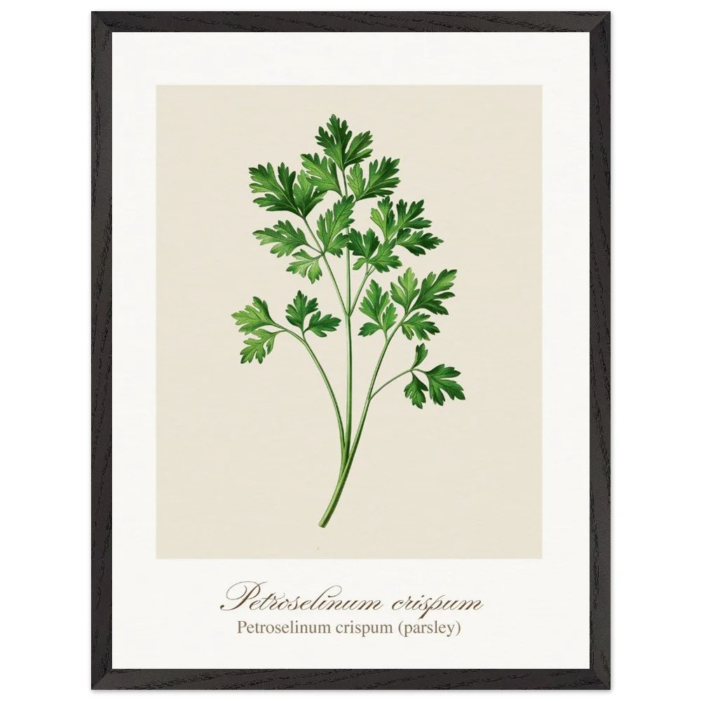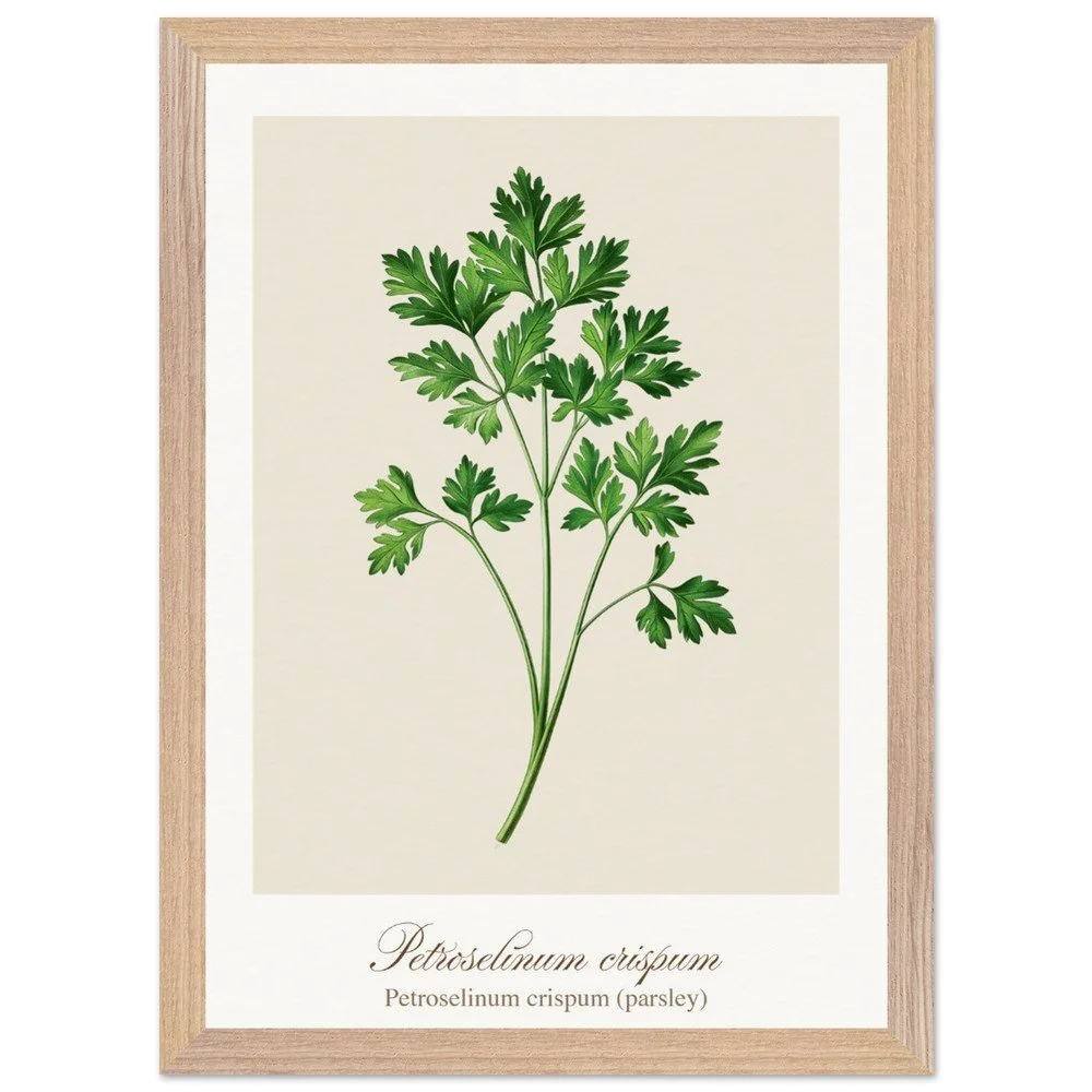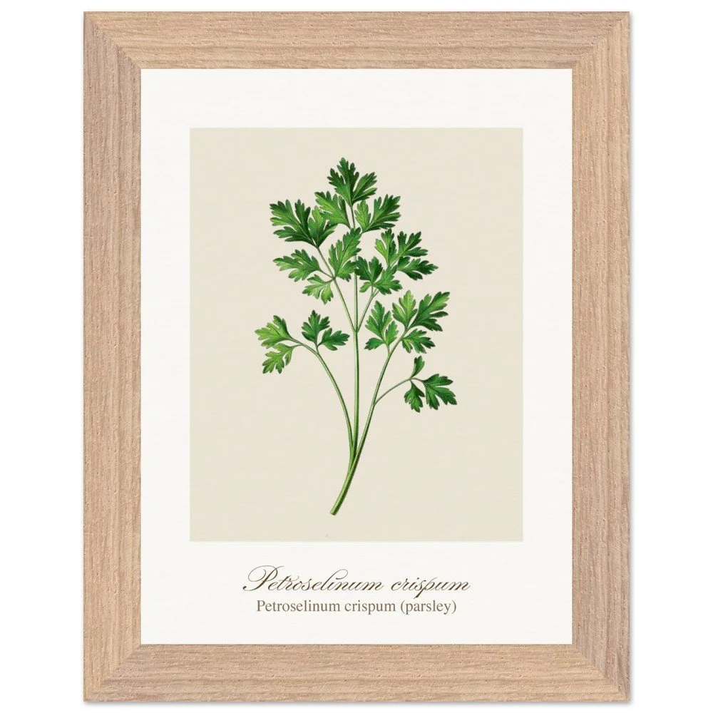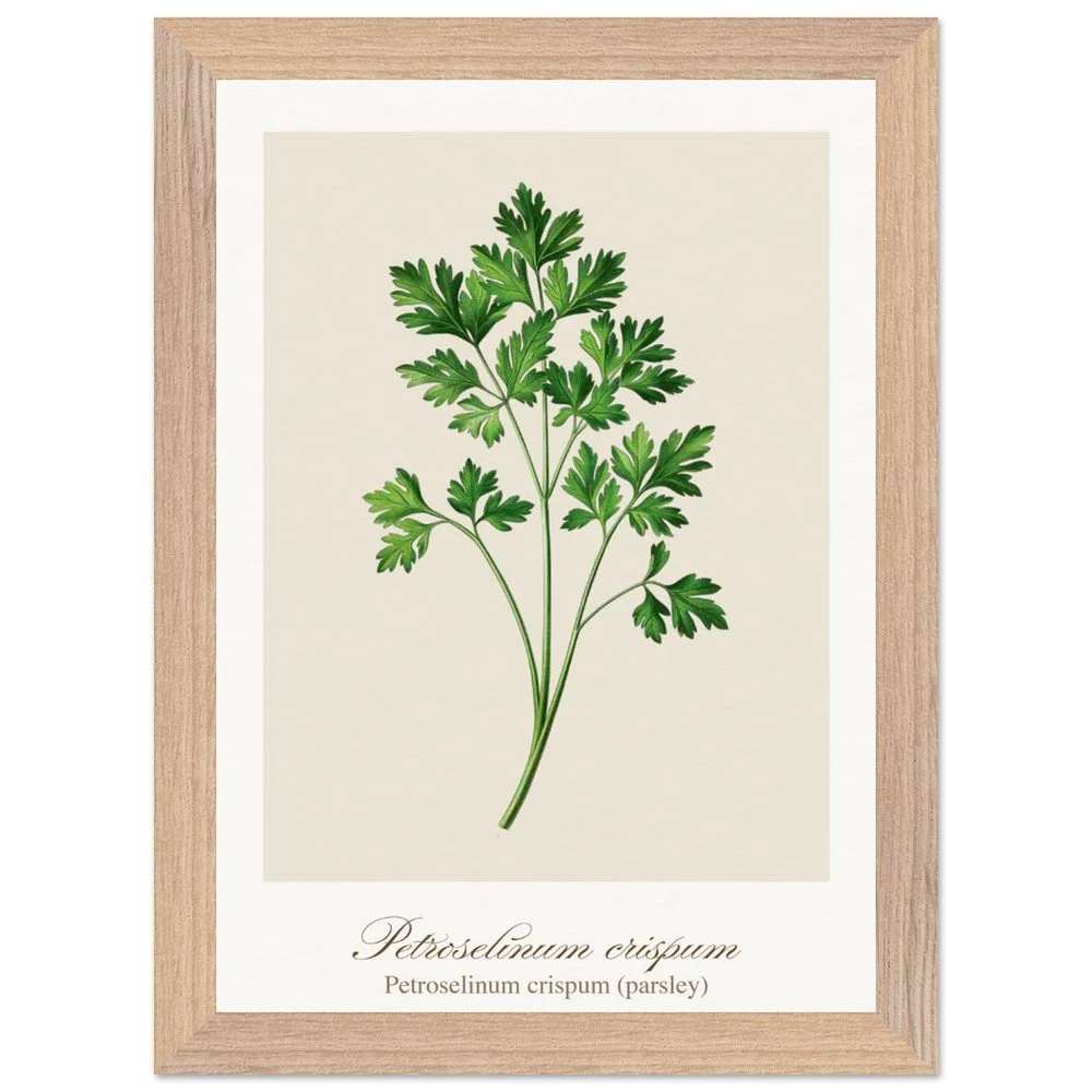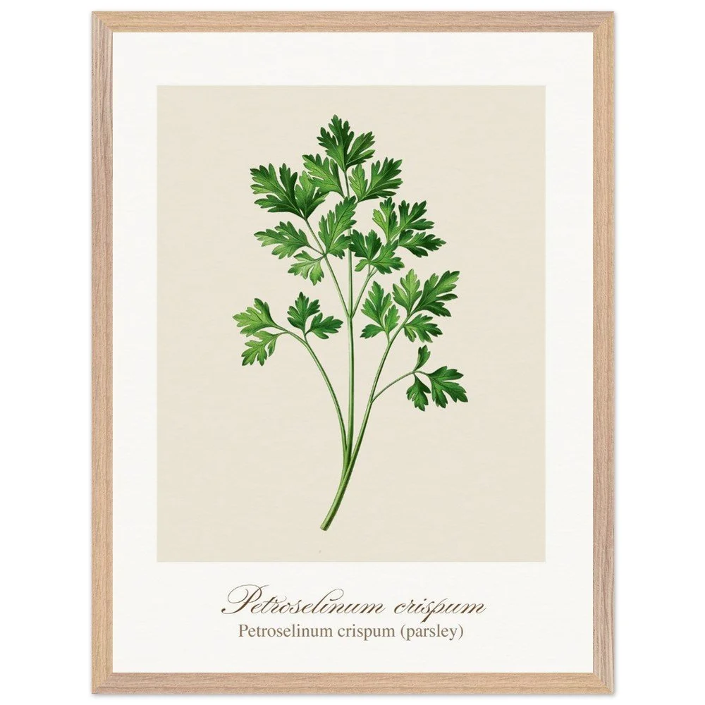 Fresh, bright, and quietly versatile, Petroselinum crispum captures the familiar charm of parsley—long valued not only as a garnish, but as a symbol of renewal and vitality in ancient traditions. Its lively leaf forms and soft green tones bring a sense of lightness to kitchens and dining areas. Ideal for pairing with other culinary herbs, this print adds balance and freshness to a curated botanical wall. PRODUCT DETAILS • Framed Print - Ready-to-hang, responsibly sourced oak or ash • Paper - Museum-quality paper—off-white, uncoated, 250 gsm • Protection - Shatterproof plexiglass protects the framed art