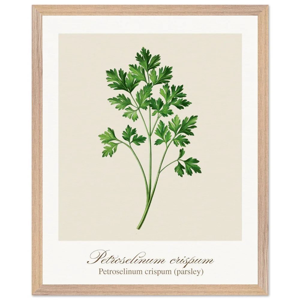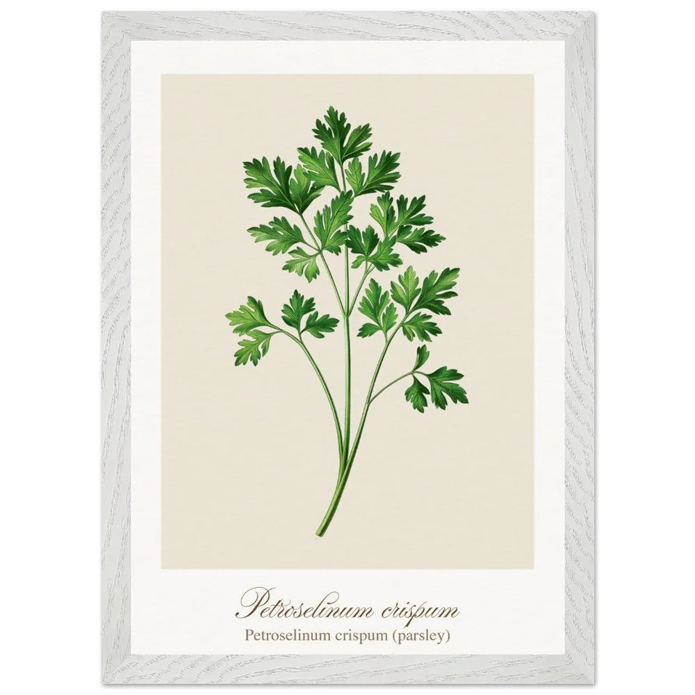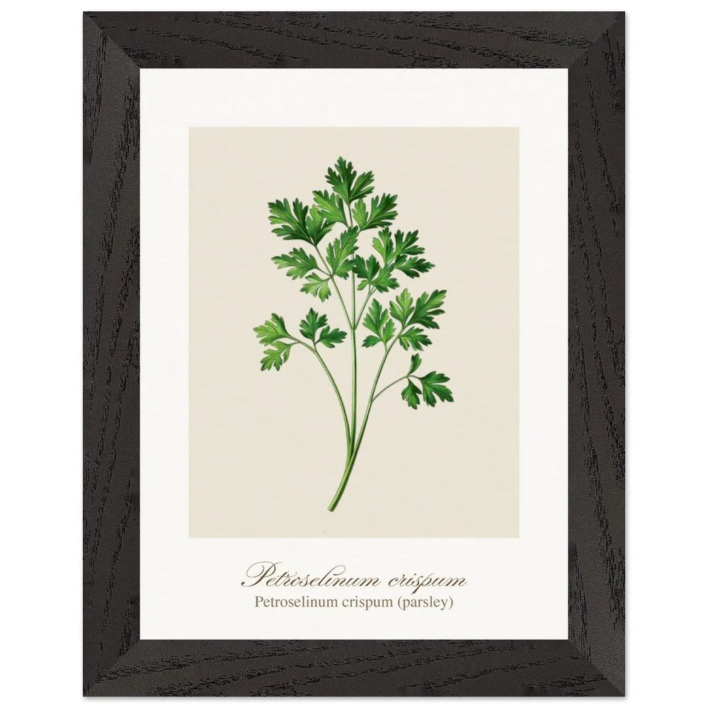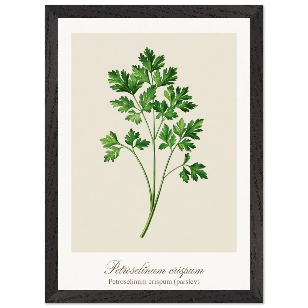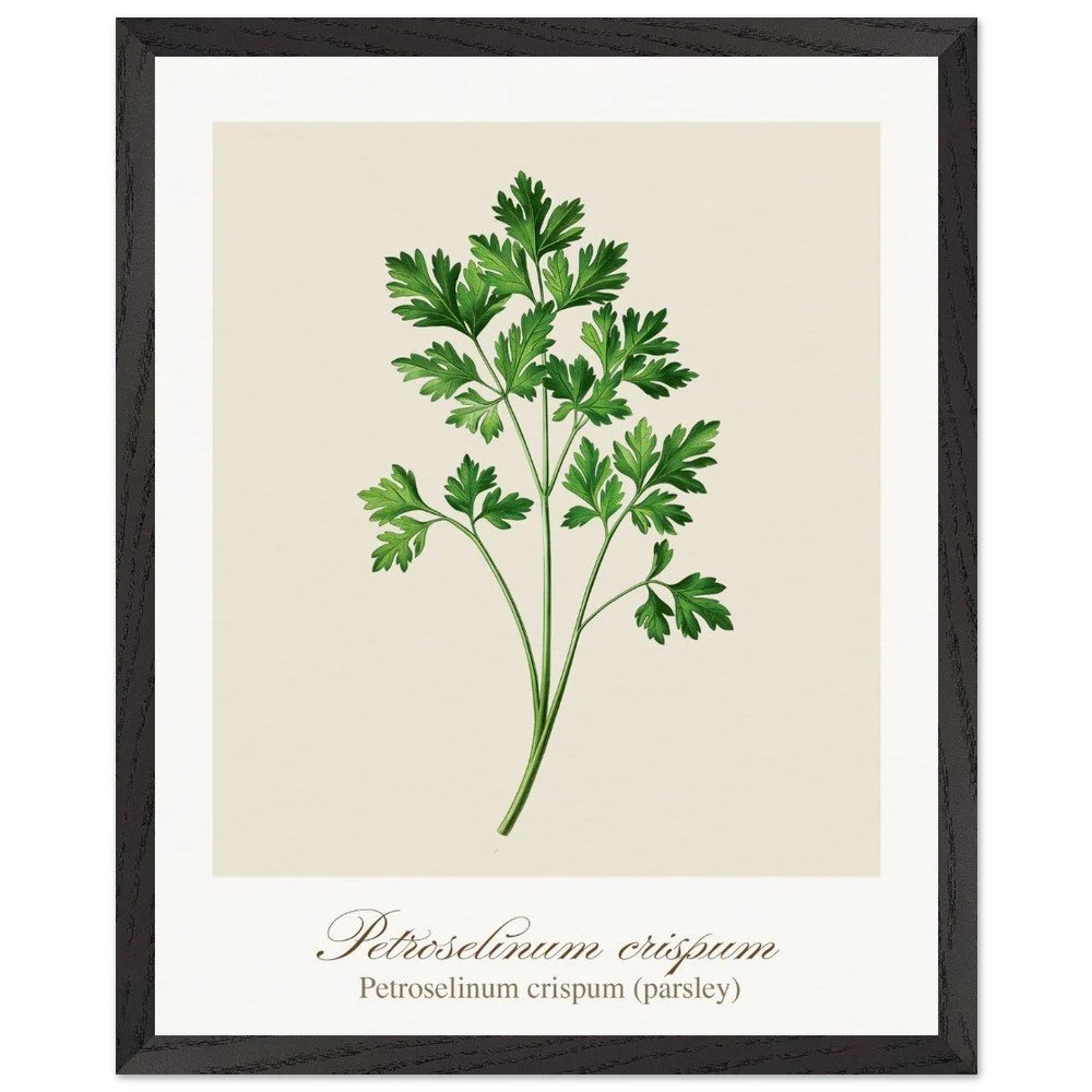 Fresh, bright, and quietly versatile, Petroselinum crispum captures the familiar charm of parsley—long valued not only as a garnish, but as a symbol of renewal and vitality in ancient traditions. Its lively leaf forms and soft green tones bring a sense of lightness to kitchens and dining areas. Ideal for pairing with other culinary herbs, this print adds balance and freshness to a curated botanical wall. PRODUCT DETAILS • Framed Print - Ready-to-hang, responsibly sourced oak or ash • Paper - Museum-quality paper—off-white, uncoated, 250 gsm • Protection - Shatterproof plexiglass protects the framed art
