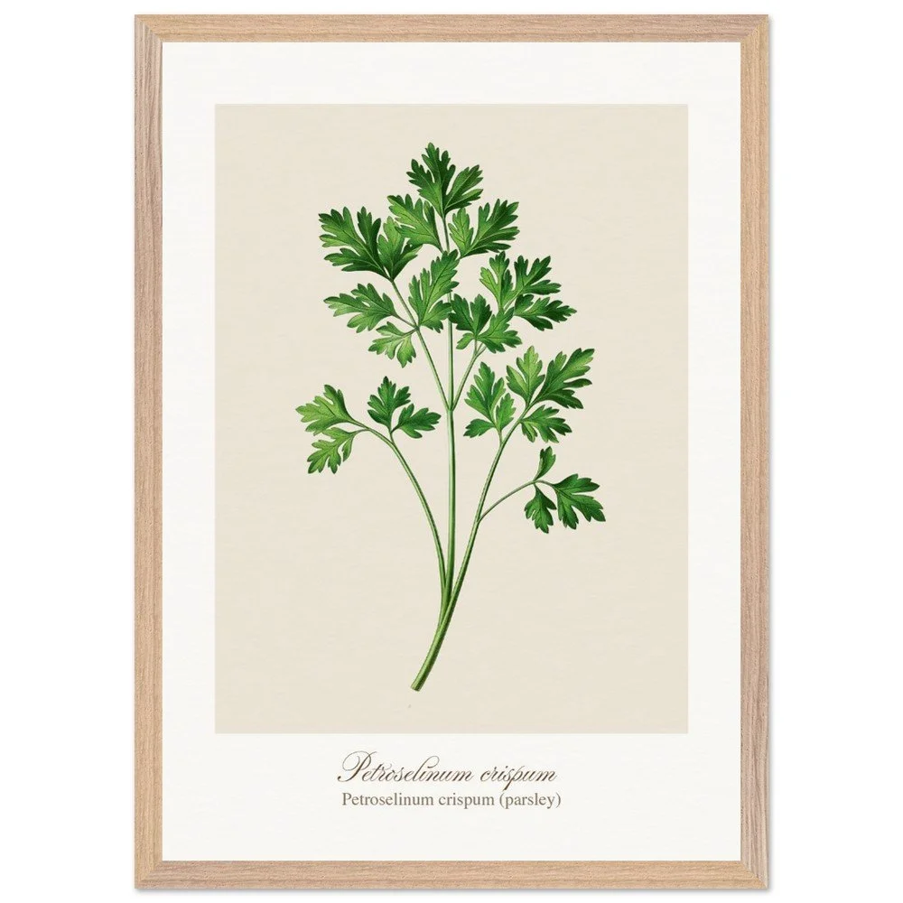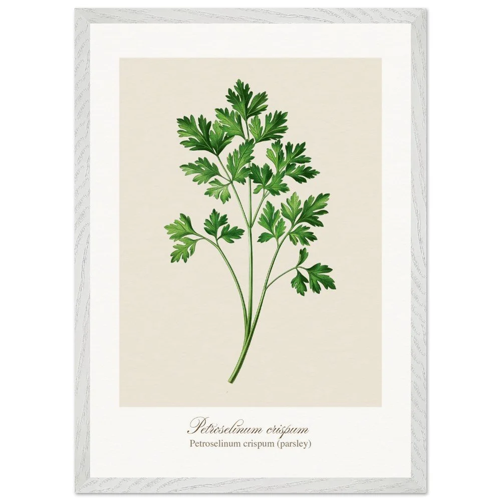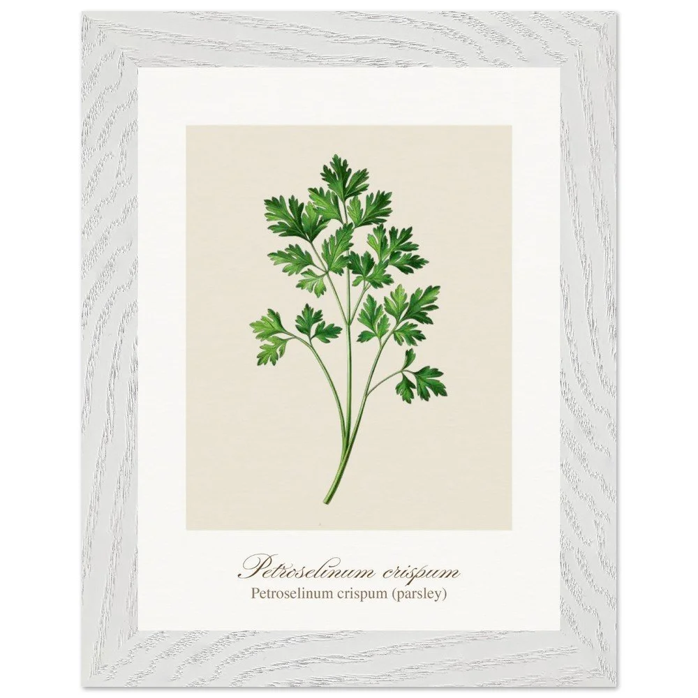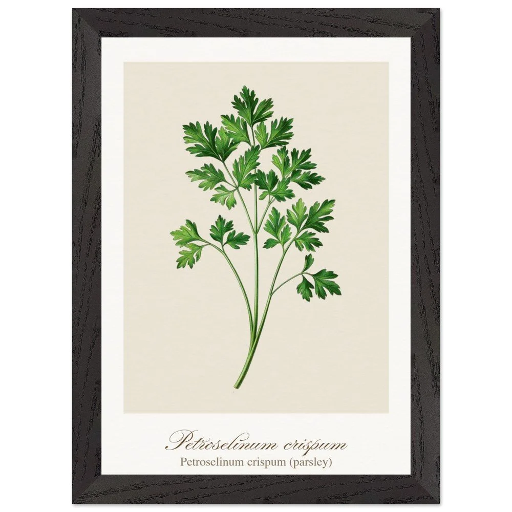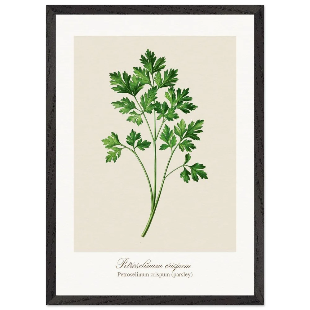 Fresh, bright, and quietly versatile, Petroselinum crispum captures the familiar charm of parsley—long valued not only as a garnish, but as a symbol of renewal and vitality in ancient traditions. Its lively leaf forms and soft green tones bring a sense of lightness to kitchens and dining areas. Ideal for pairing with other culinary herbs, this print adds balance and freshness to a curated botanical wall. PRODUCT DETAILS • Framed Print - Ready-to-hang, responsibly sourced oak or ash • Paper - Museum-quality paper—off-white, uncoated, 250 gsm • Protection - Shatterproof plexiglass protects the framed art