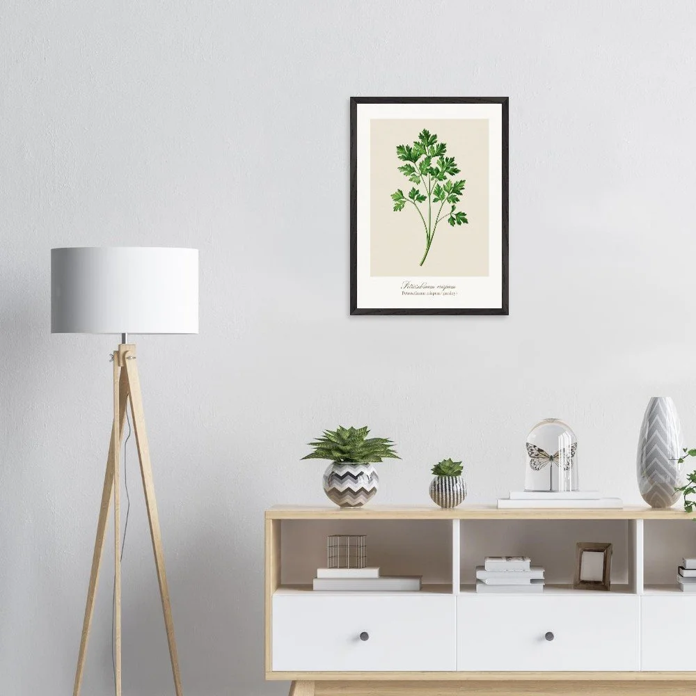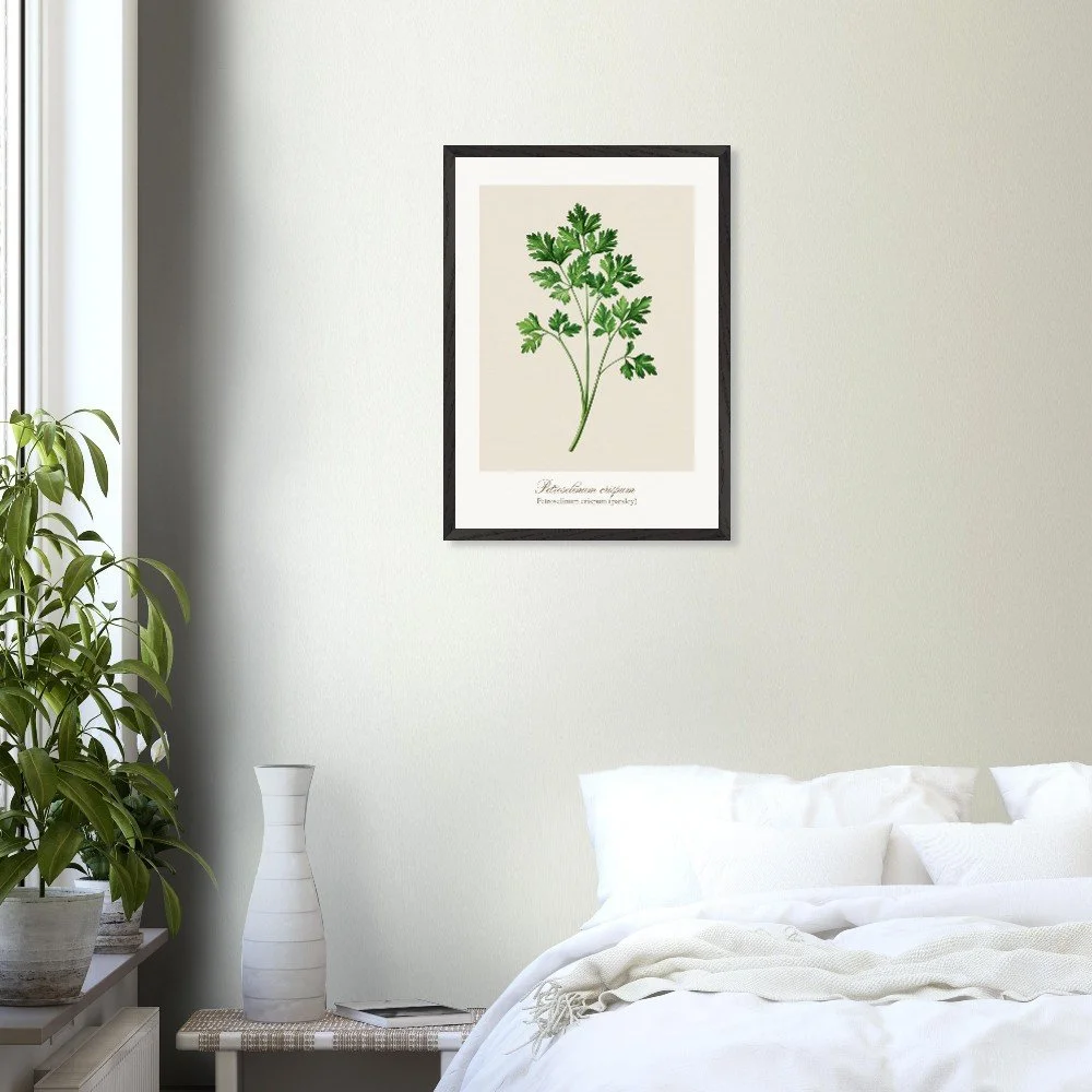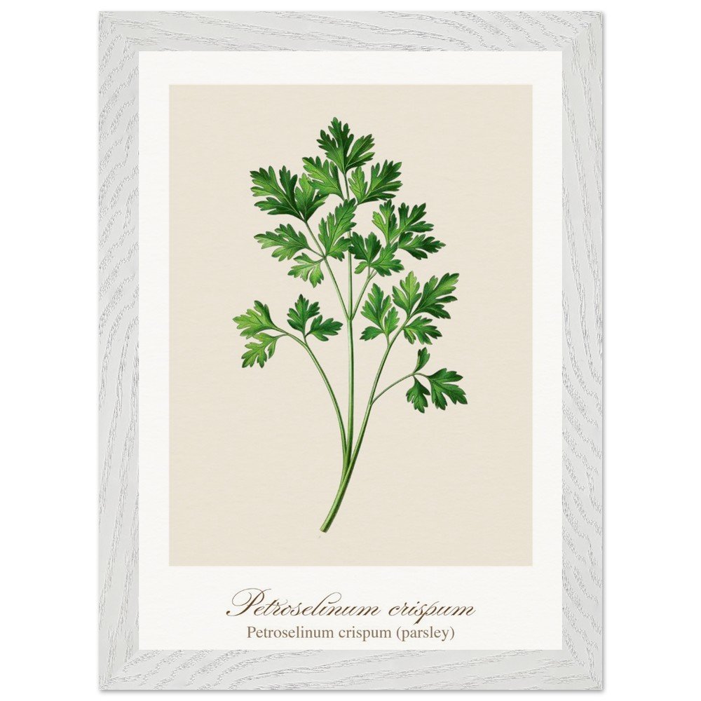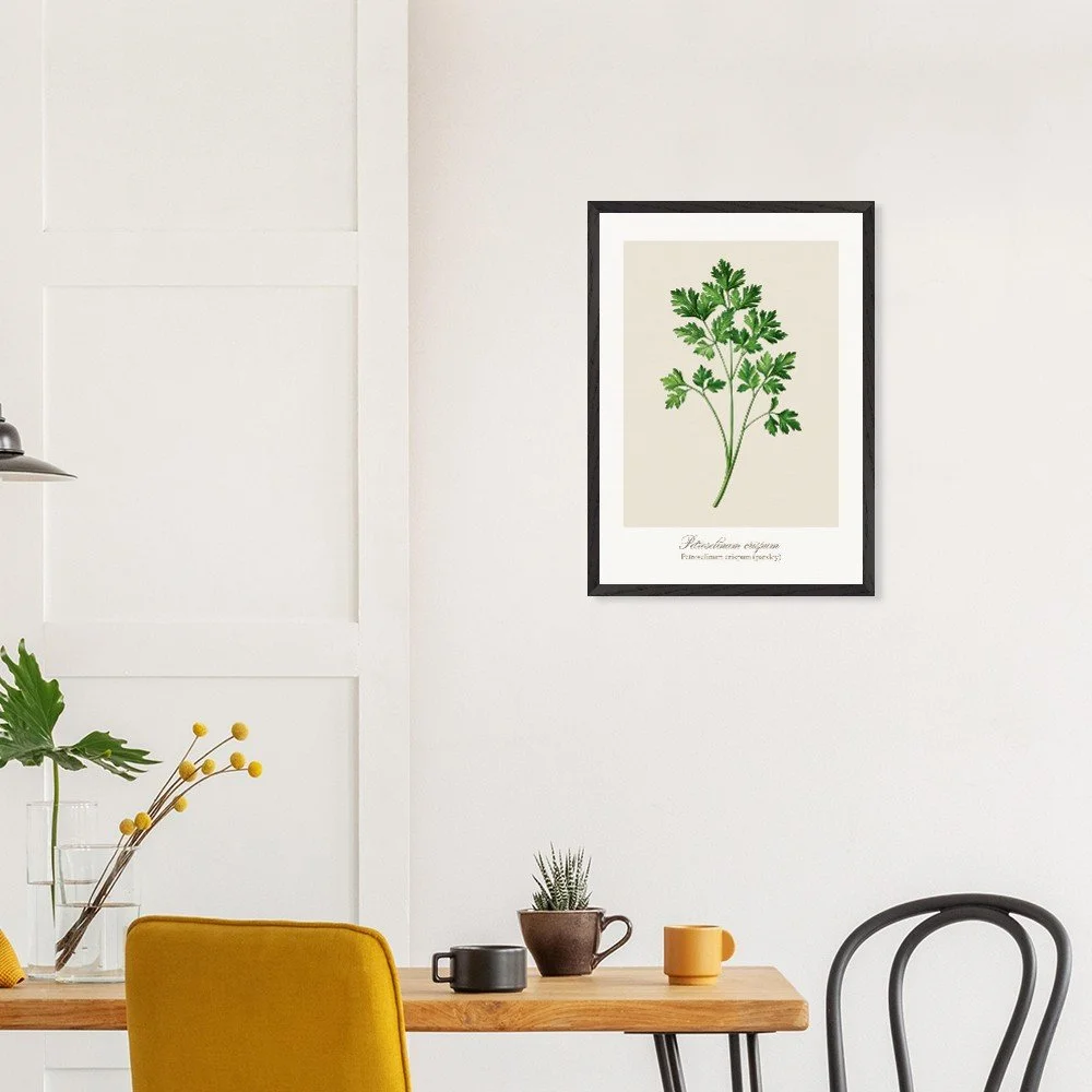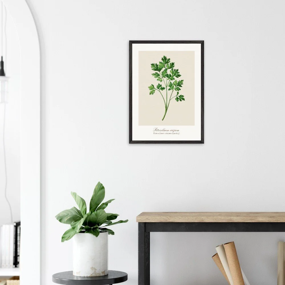Fresh, bright, and quietly versatile, Petroselinum crispum captures the familiar charm of parsley—long valued not only as a garnish, but as a symbol of renewal and vitality in ancient traditions. Its lively leaf forms and soft green tones bring a sense of lightness to kitchens and dining areas. Ideal for pairing with other culinary herbs, this print adds balance and freshness to a curated botanical wall. PRODUCT DETAILS • Framed Print - Ready-to-hang, responsibly sourced oak or ash • Paper - Museum-quality paper—off-white, uncoated, 250 gsm • Protection - Shatterproof plexiglass protects the framed art
