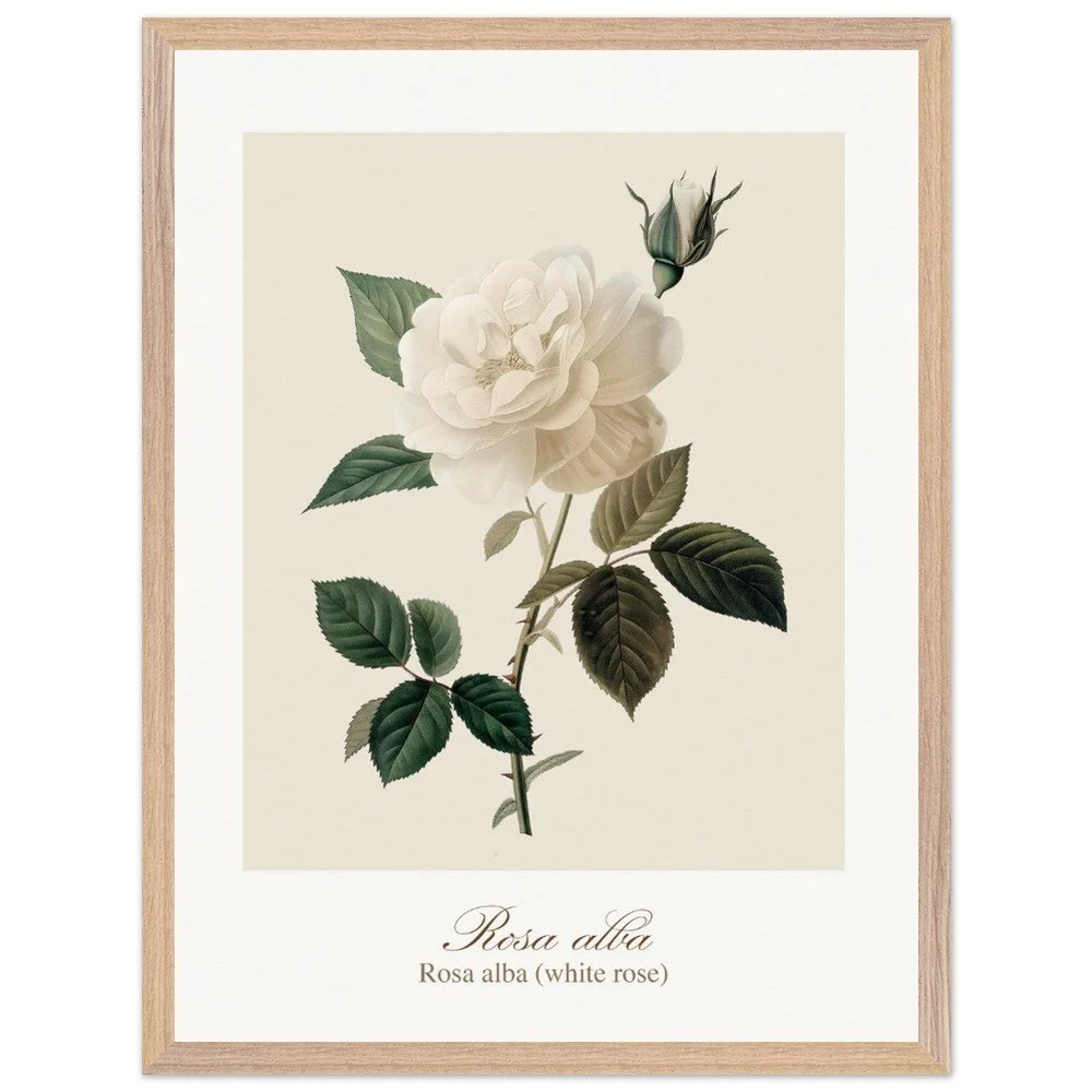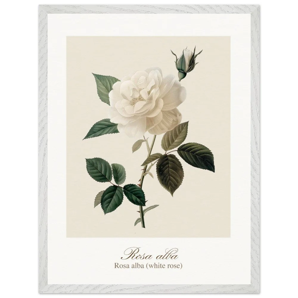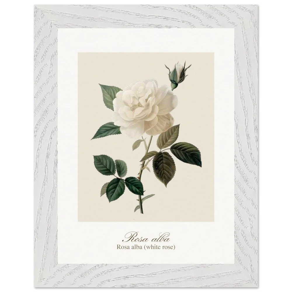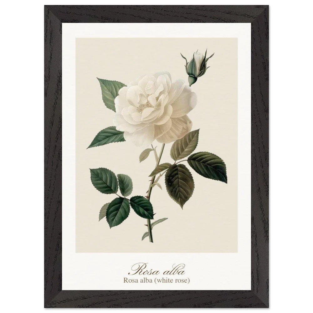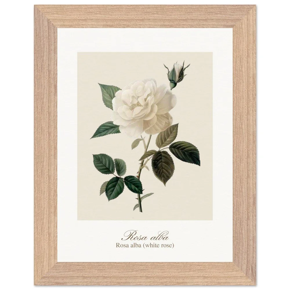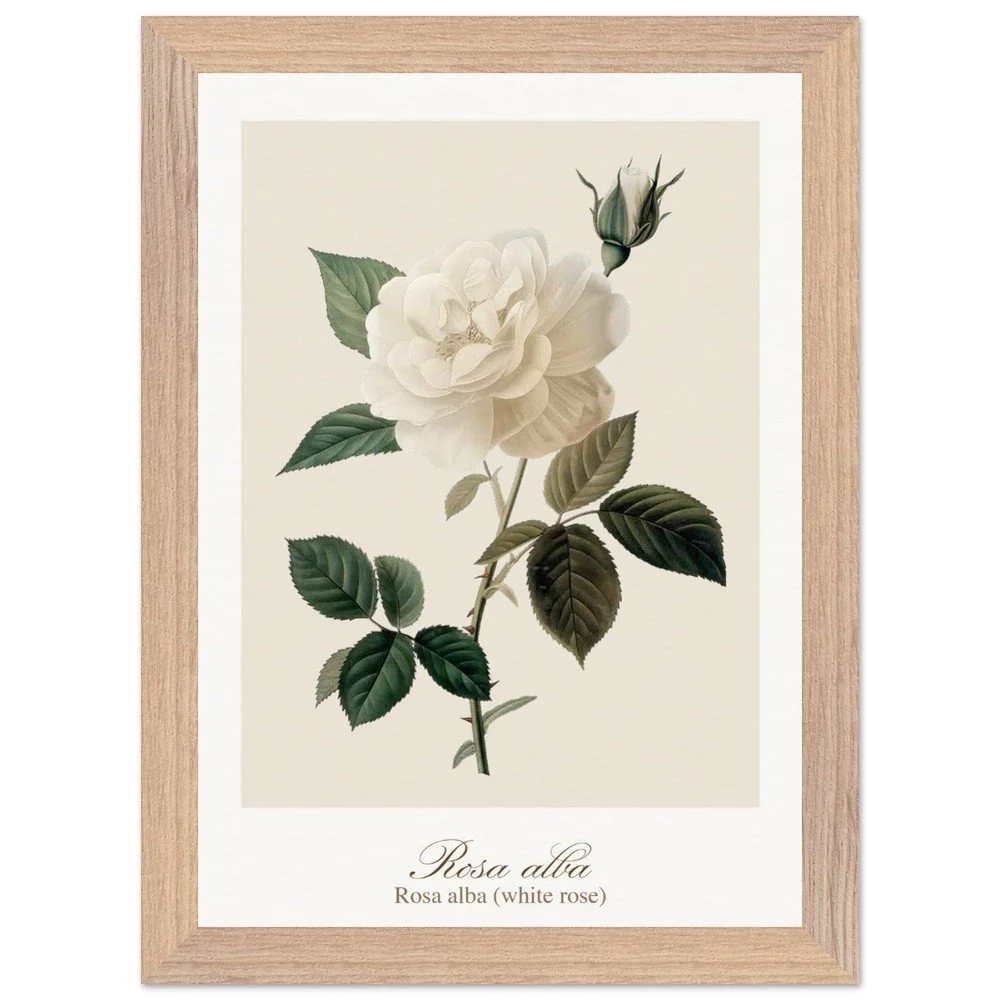 Pure, soft, and quietly luminous, Rosa alba embodies the timeless elegance of the white rose—delicate in tone yet rich in symbolism. Cultivated since antiquity, Rosa alba has long been associated with purity, peace, and heritage. It is closely linked to the white rose of York, a symbol woven into English history, and has appeared for centuries in gardens, art, and literature. Its pale petals, often touched with hints of cream or blush, give it a gentle, almost ethereal presence. This print brings lightness and calm to any space—perfect for bedrooms, hallways, or minimalist interiors. Its subtle palette works beautifully with neutral tones, soft textiles, and natural materials, or as part of a curated botanical gallery wall. PRODUCT DETAILS • Framed Print - Ready-to-hang, responsibly sourced oak or ash • Paper - Museum-quality paper—off-white, uncoated, 250 gsm • Protection - Shatterproof plexiglass protects the framed art