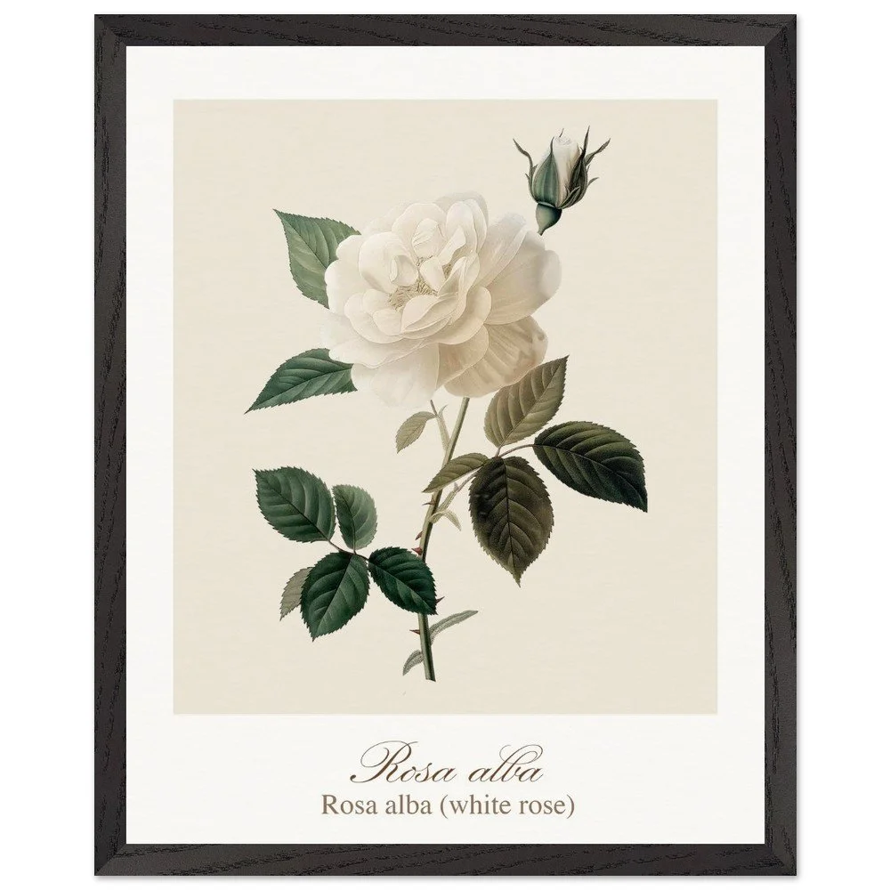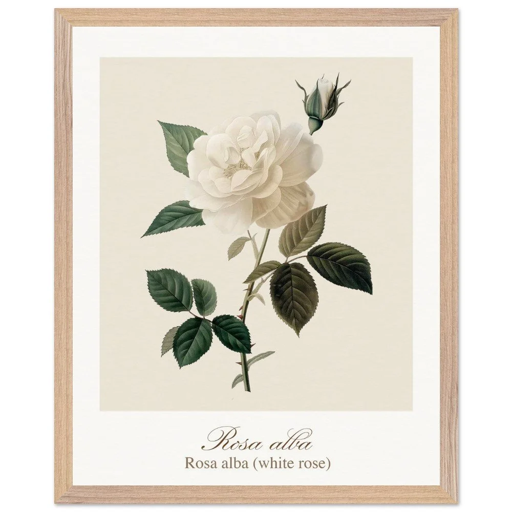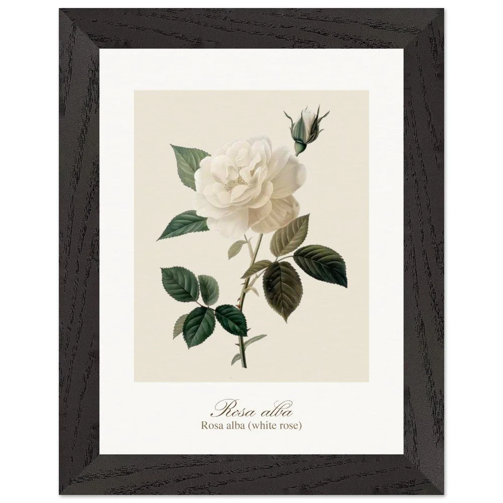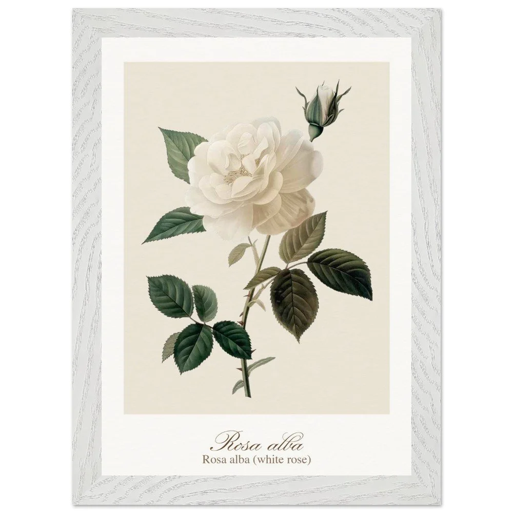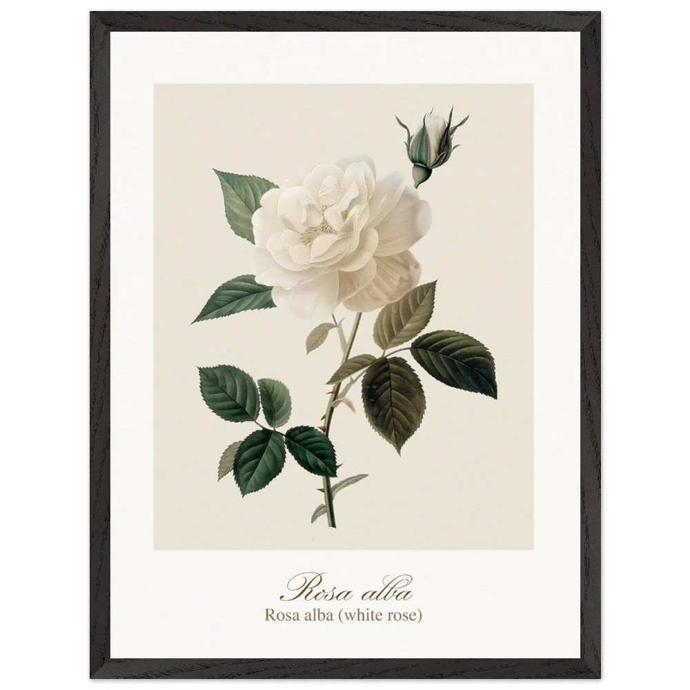 Pure, soft, and quietly luminous, Rosa alba embodies the timeless elegance of the white rose—delicate in tone yet rich in symbolism. Cultivated since antiquity, Rosa alba has long been associated with purity, peace, and heritage. It is closely linked to the white rose of York, a symbol woven into English history, and has appeared for centuries in gardens, art, and literature. Its pale petals, often touched with hints of cream or blush, give it a gentle, almost ethereal presence. This print brings lightness and calm to any space—perfect for bedrooms, hallways, or minimalist interiors. Its subtle palette works beautifully with neutral tones, soft textiles, and natural materials, or as part of a curated botanical gallery wall. PRODUCT DETAILS • Framed Print - Ready-to-hang, responsibly sourced oak or ash • Paper - Museum-quality paper—off-white, uncoated, 250 gsm • Protection - Shatterproof plexiglass protects the framed art