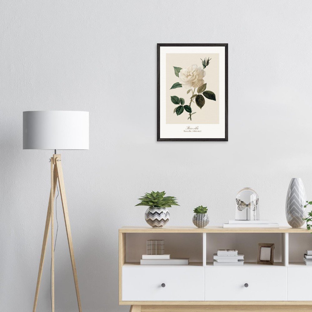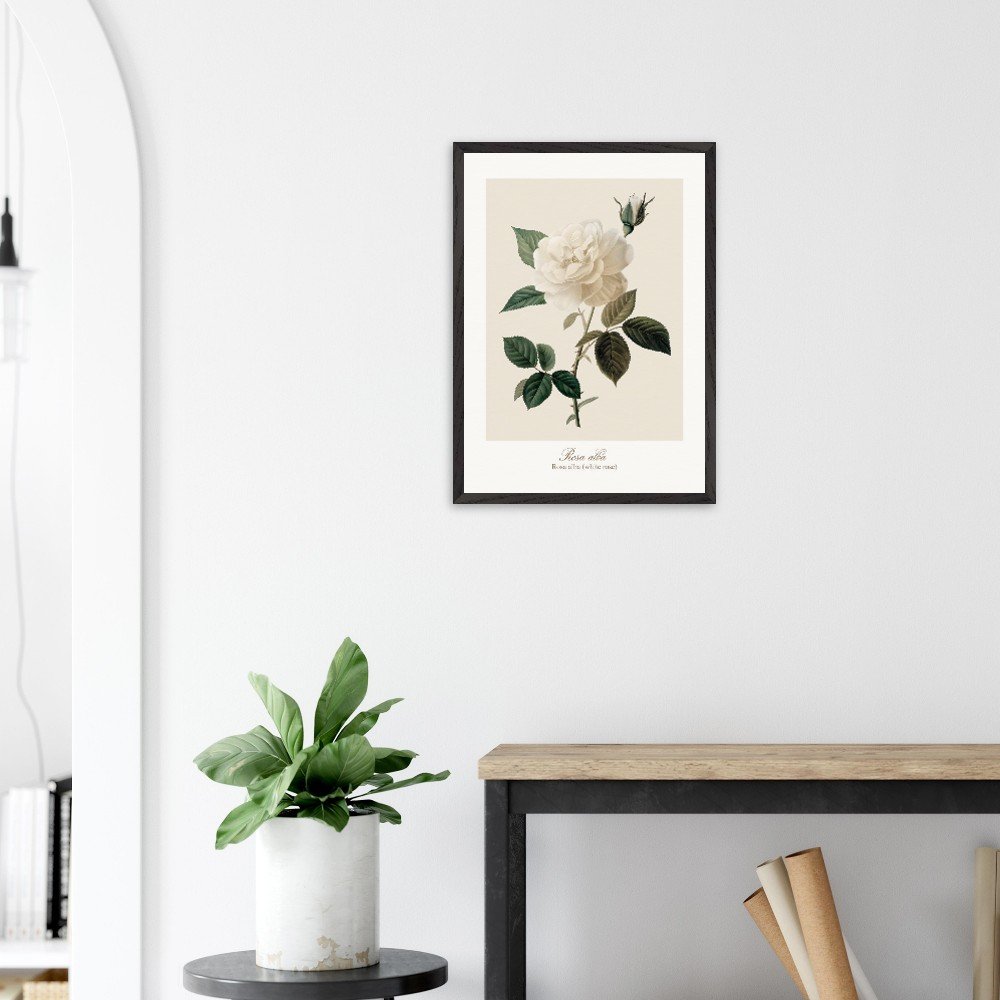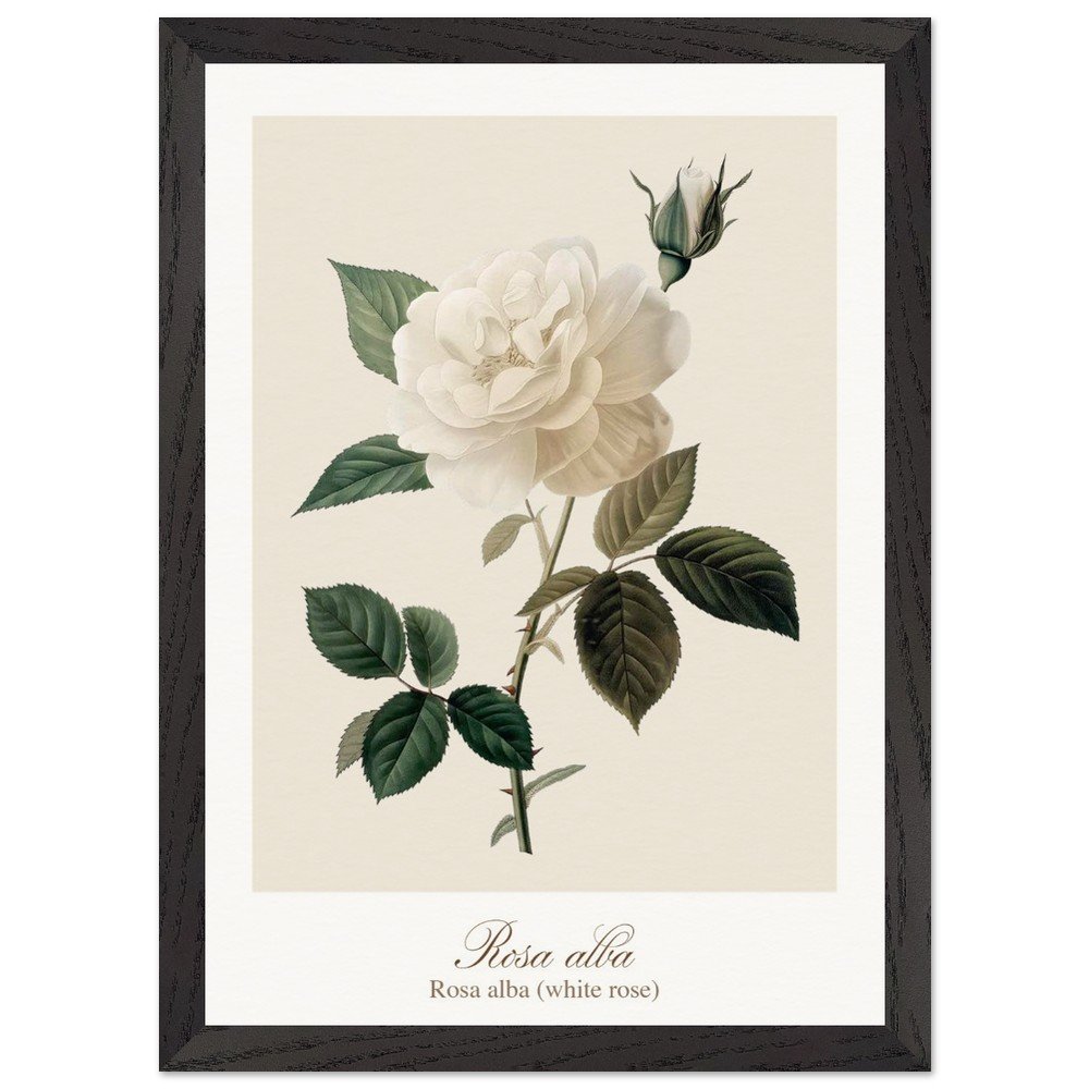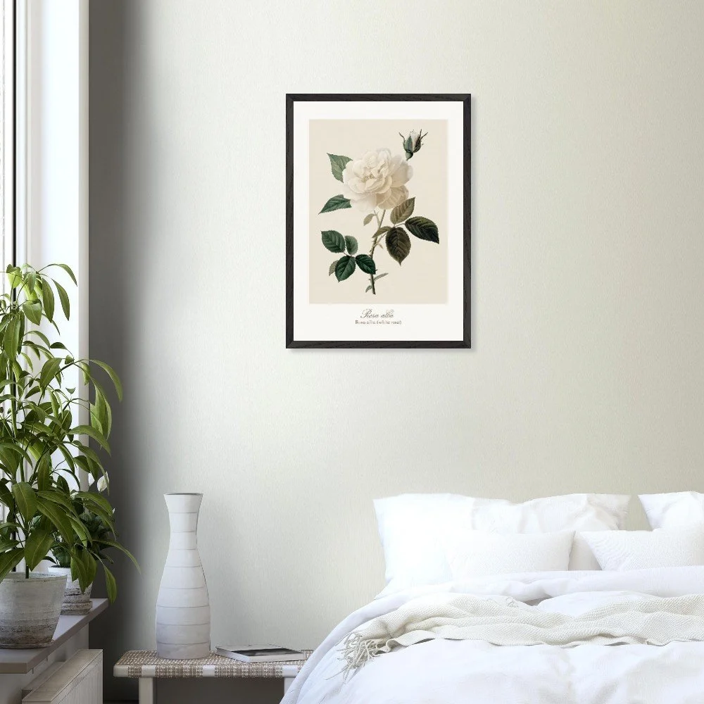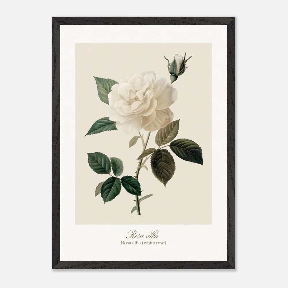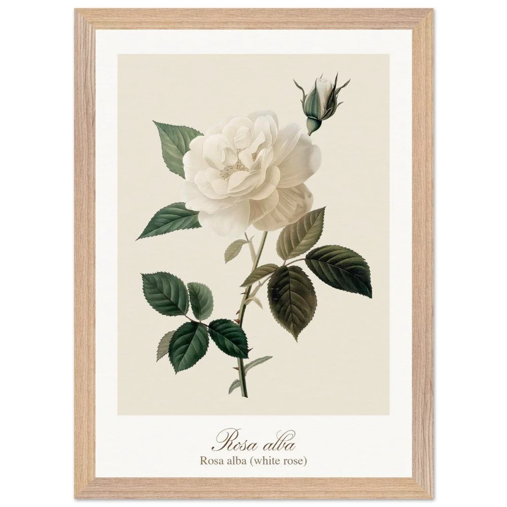 Pure, soft, and quietly luminous, Rosa alba embodies the timeless elegance of the white rose—delicate in tone yet rich in symbolism. Cultivated since antiquity, Rosa alba has long been associated with purity, peace, and heritage. It is closely linked to the white rose of York, a symbol woven into English history, and has appeared for centuries in gardens, art, and literature. Its pale petals, often touched with hints of cream or blush, give it a gentle, almost ethereal presence. This print brings lightness and calm to any space—perfect for bedrooms, hallways, or minimalist interiors. Its subtle palette works beautifully with neutral tones, soft textiles, and natural materials, or as part of a curated botanical gallery wall. PRODUCT DETAILS • Framed Print - Ready-to-hang, responsibly sourced oak or ash • Paper - Museum-quality paper—off-white, uncoated, 250 gsm • Protection - Shatterproof plexiglass protects the framed art