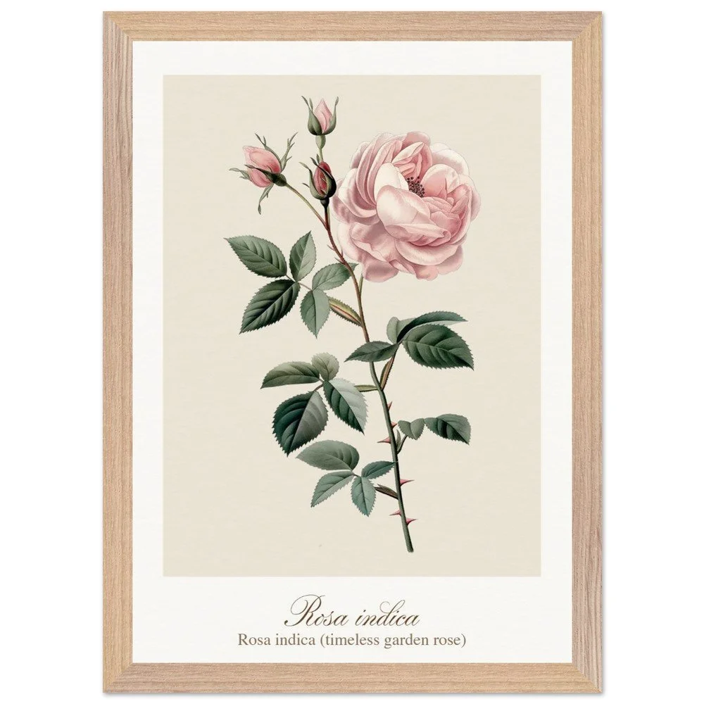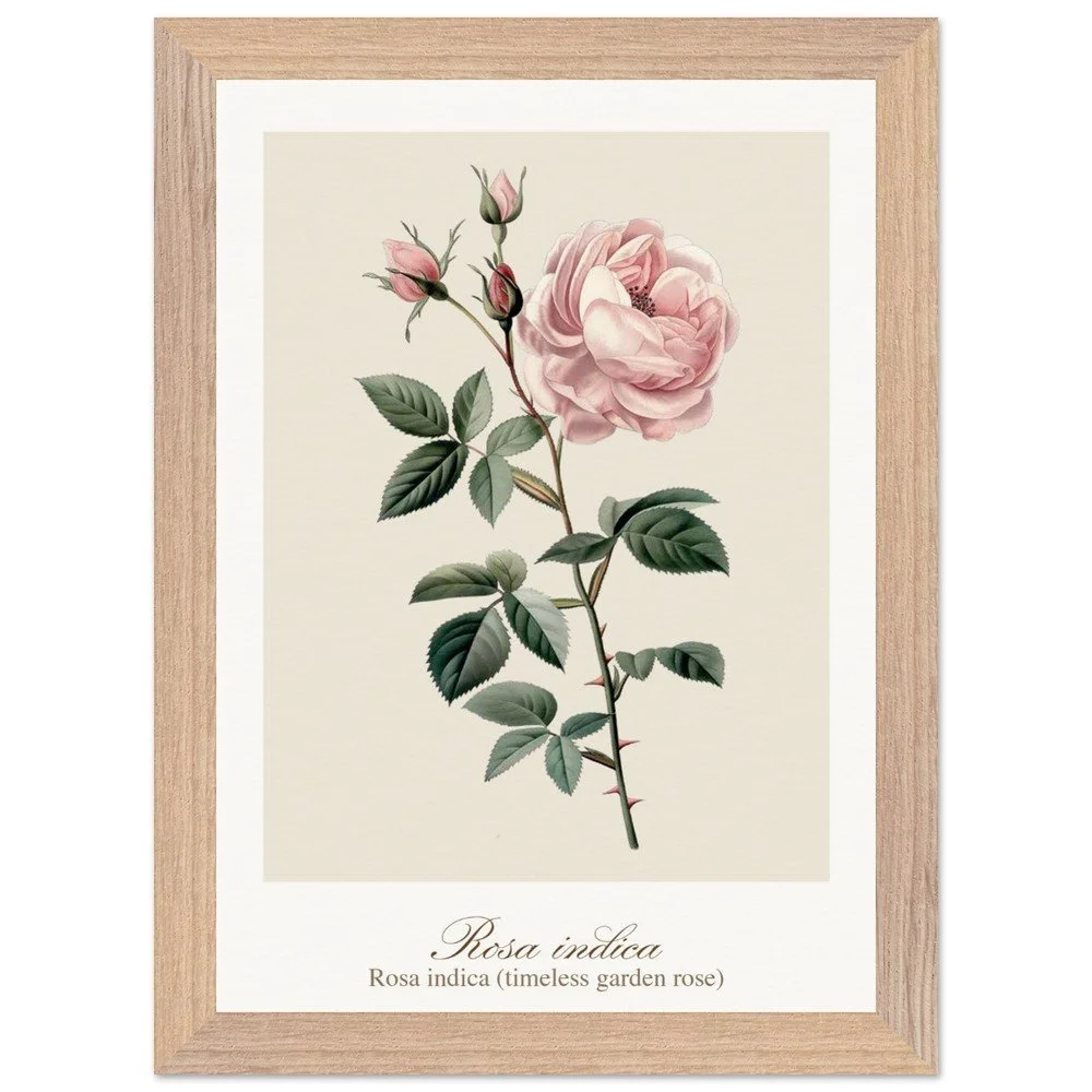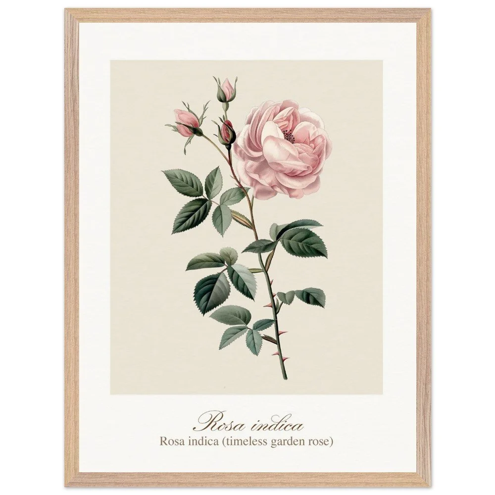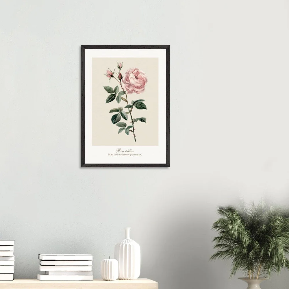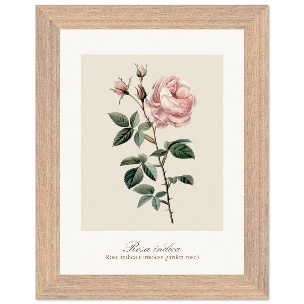 Graceful and understated, Rosa indica captures the quiet beauty of one of the earliest cultivated roses—elegant in form, refined in detail, and enduring in its appeal. Believed to originate from Asia and widely introduced into European gardens, Rosa indica played a key role in the development of many modern rose varieties. Its slender stem, soft petals, and delicate buds reflect a more natural, less formal expression of the rose—closer to how it appears in the wild. This piece brings a sense of calm and balance to interiors, making it ideal for bedrooms, hallways, or relaxed living spaces. Its simplicity pairs beautifully with neutral palettes, natural textures, and other botanical prints for a cohesive gallery wall. PRODUCT DETAILS • Framed Print - Ready-to-hang, responsibly sourced oak or ash • Paper - Museum-quality paper—off-white, uncoated, 250 gsm • Protection - Shatterproof plexiglass protects the framed art