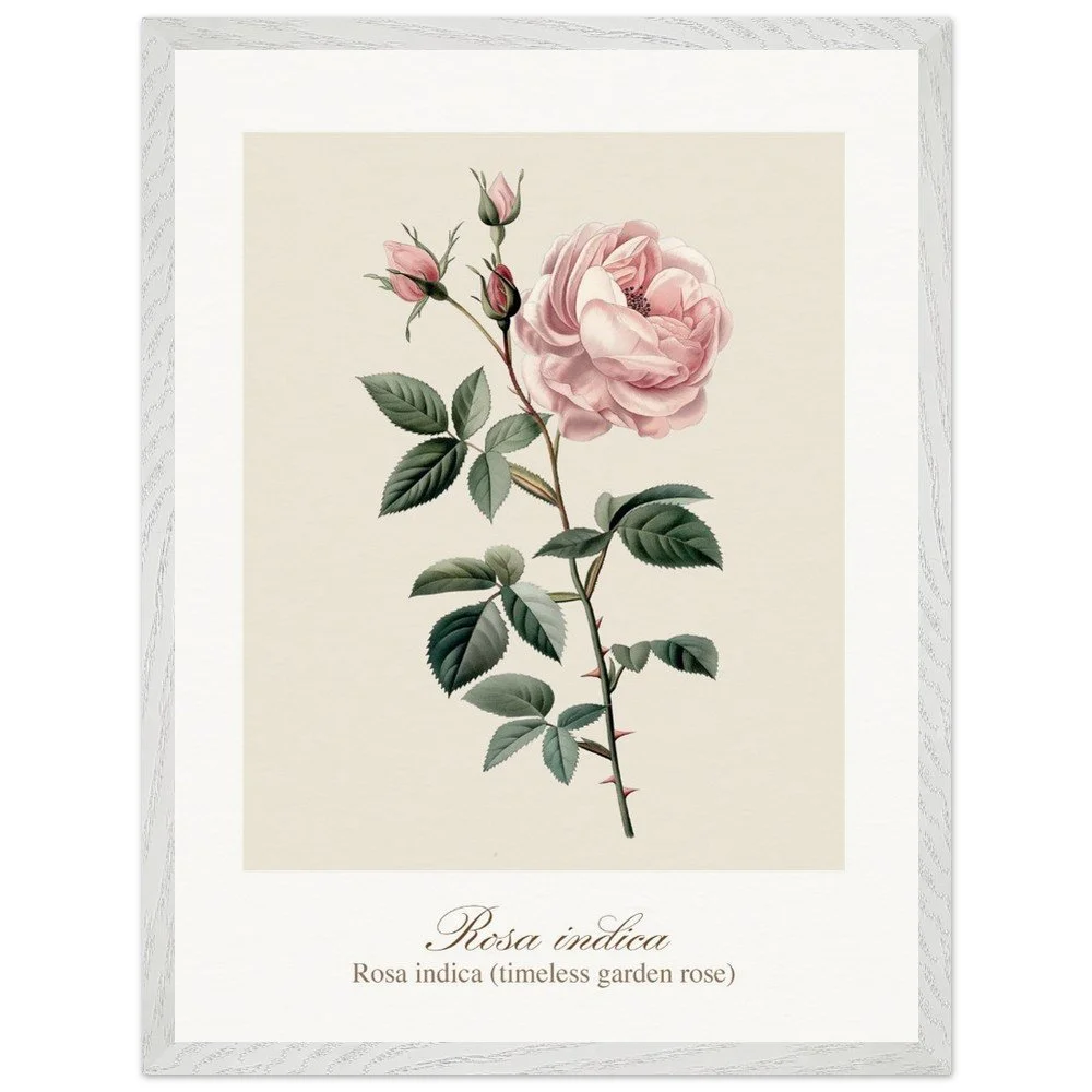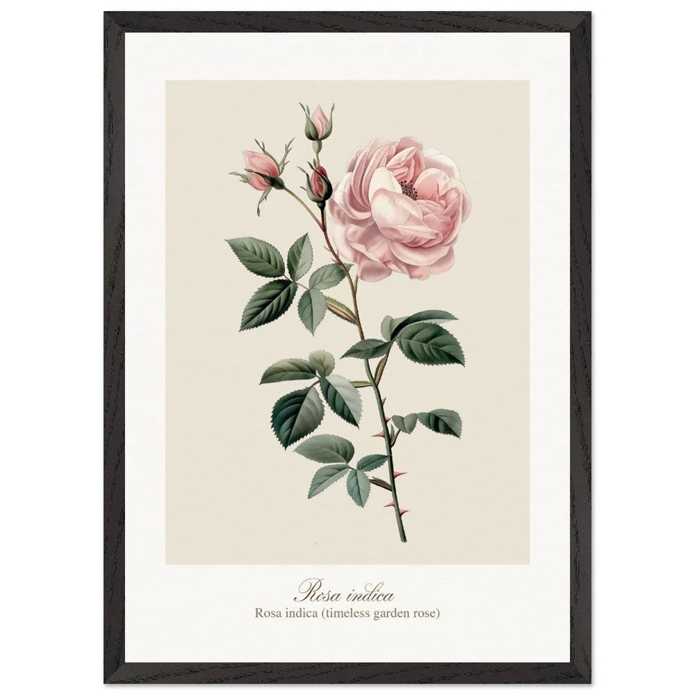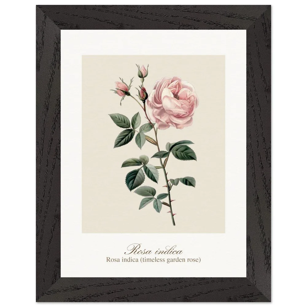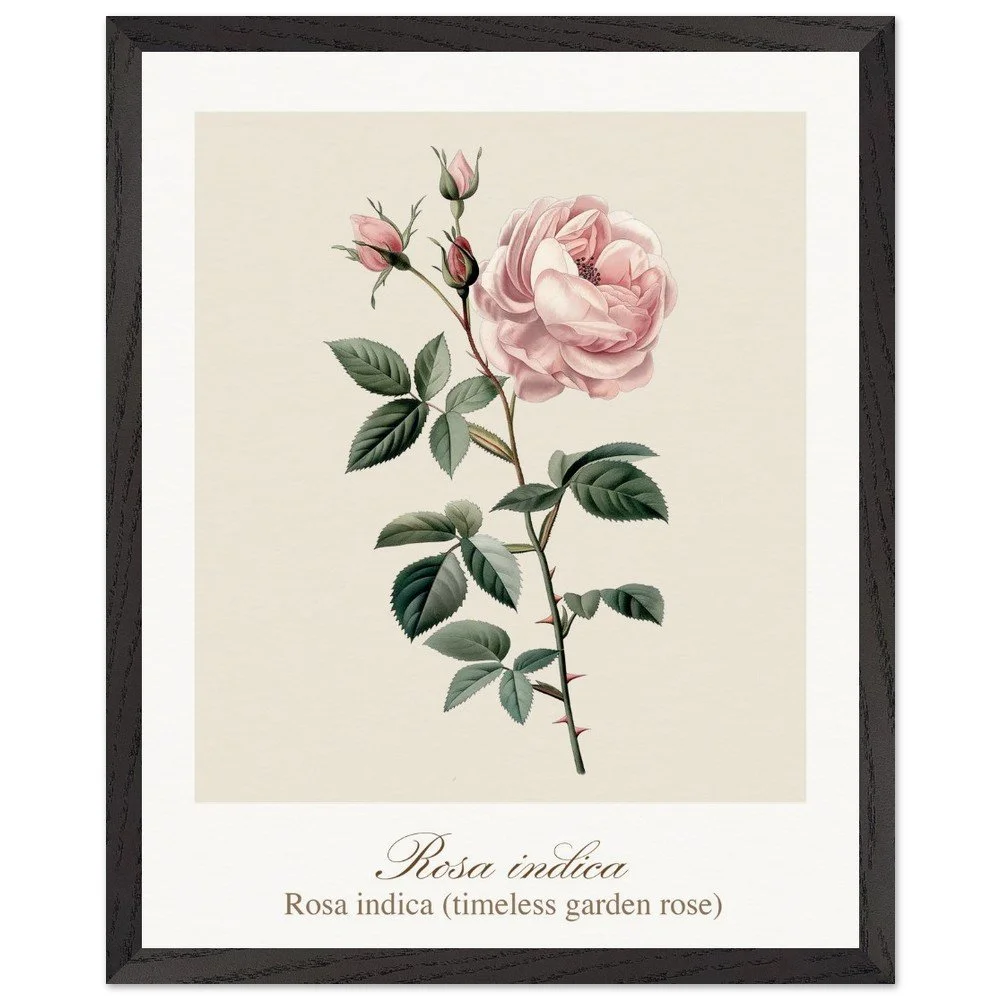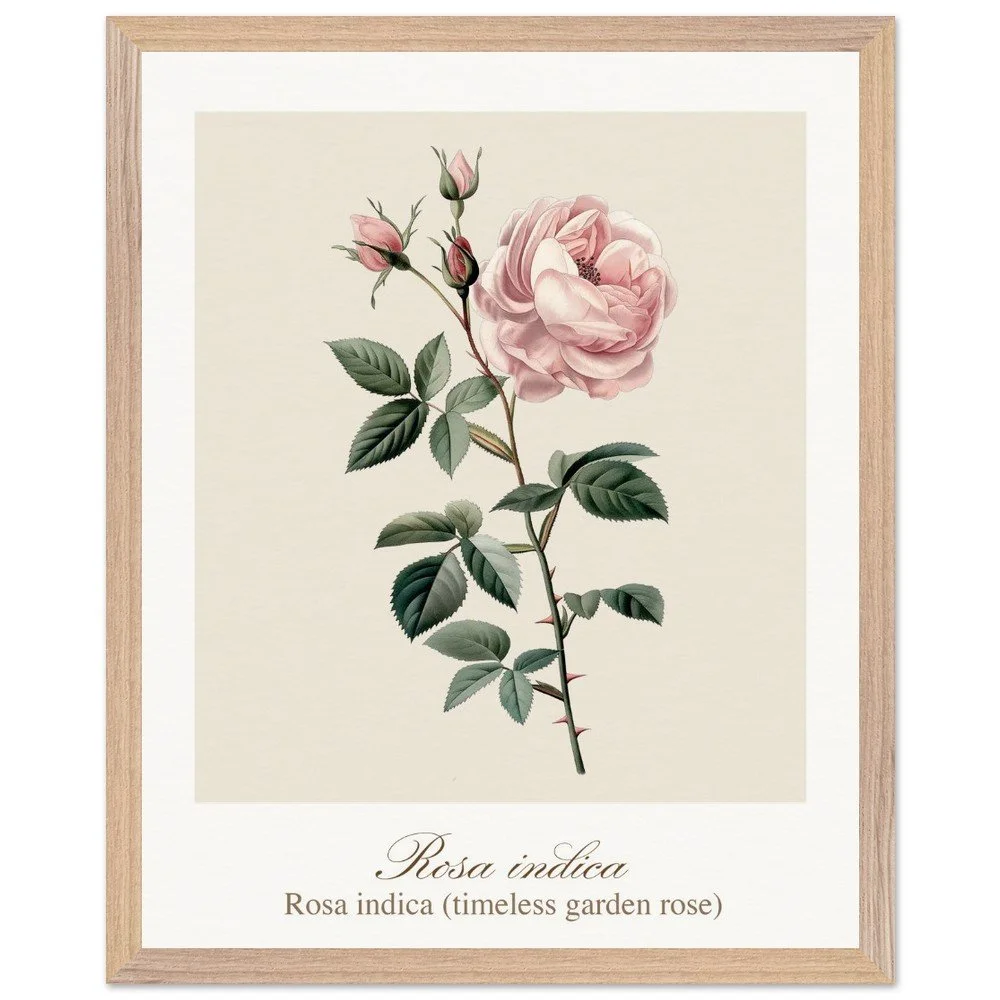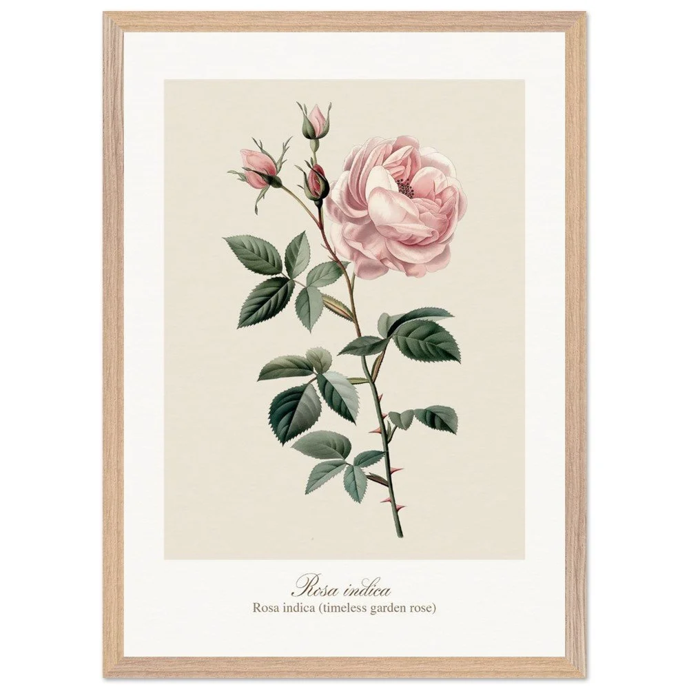 Graceful and understated, Rosa indica captures the quiet beauty of one of the earliest cultivated roses—elegant in form, refined in detail, and enduring in its appeal. Believed to originate from Asia and widely introduced into European gardens, Rosa indica played a key role in the development of many modern rose varieties. Its slender stem, soft petals, and delicate buds reflect a more natural, less formal expression of the rose—closer to how it appears in the wild. This piece brings a sense of calm and balance to interiors, making it ideal for bedrooms, hallways, or relaxed living spaces. Its simplicity pairs beautifully with neutral palettes, natural textures, and other botanical prints for a cohesive gallery wall. PRODUCT DETAILS • Framed Print - Ready-to-hang, responsibly sourced oak or ash • Paper - Museum-quality paper—off-white, uncoated, 250 gsm • Protection - Shatterproof plexiglass protects the framed art