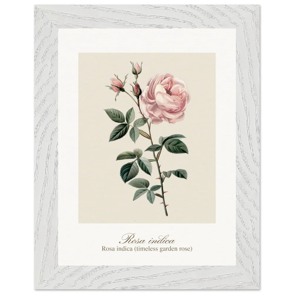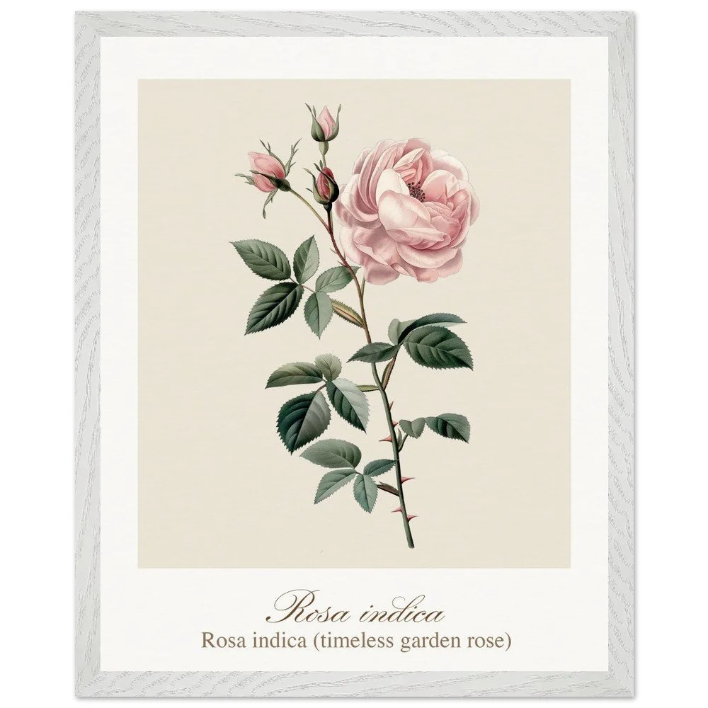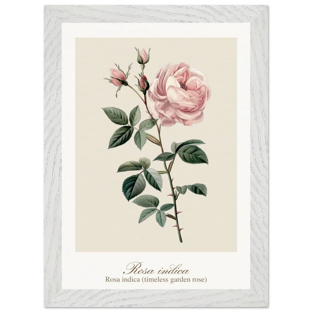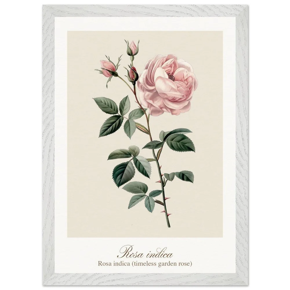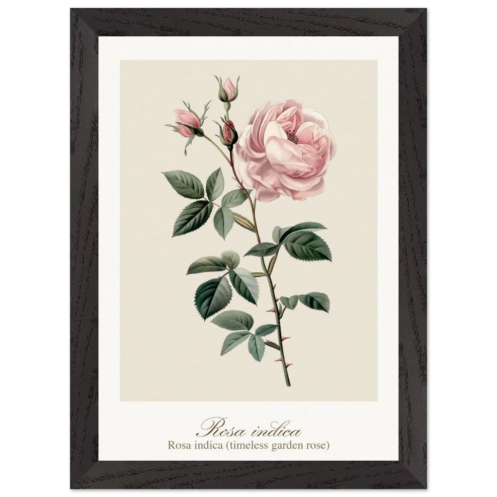 Graceful and understated, Rosa indica captures the quiet beauty of one of the earliest cultivated roses—elegant in form, refined in detail, and enduring in its appeal. Believed to originate from Asia and widely introduced into European gardens, Rosa indica played a key role in the development of many modern rose varieties. Its slender stem, soft petals, and delicate buds reflect a more natural, less formal expression of the rose—closer to how it appears in the wild. This piece brings a sense of calm and balance to interiors, making it ideal for bedrooms, hallways, or relaxed living spaces. Its simplicity pairs beautifully with neutral palettes, natural textures, and other botanical prints for a cohesive gallery wall. PRODUCT DETAILS • Framed Print - Ready-to-hang, responsibly sourced oak or ash • Paper - Museum-quality paper—off-white, uncoated, 250 gsm • Protection - Shatterproof plexiglass protects the framed art